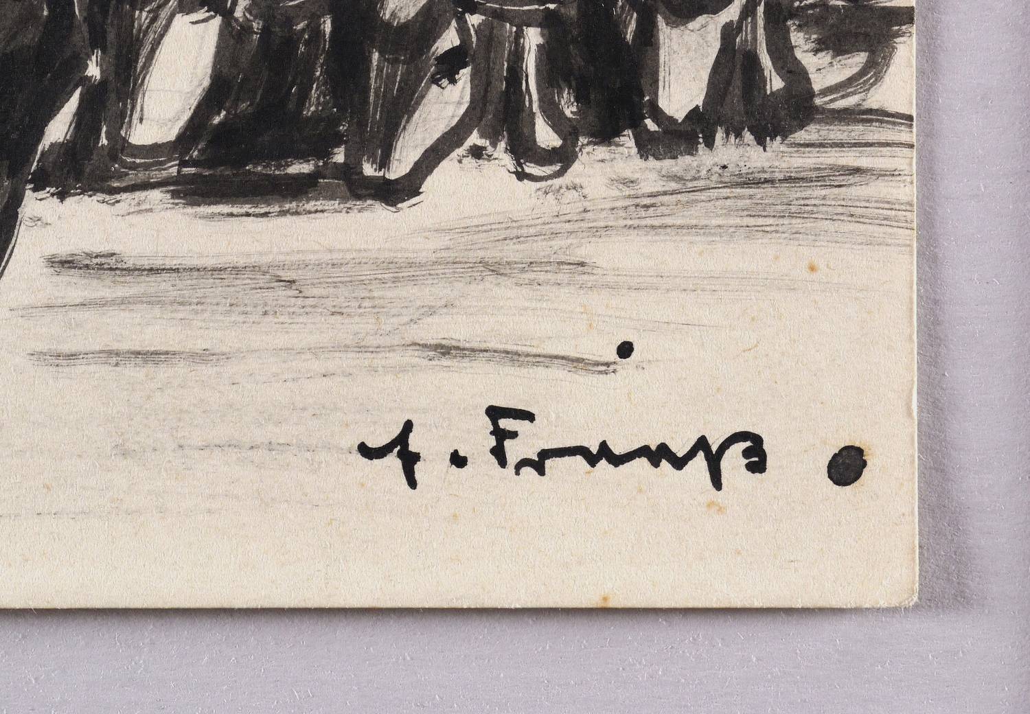 1930-1940. Zeichnung / Pinselzeichnung, in schwarzer Tusche, auf hellgelbem Velin. – Originale Künstlergrafik, von Erich Fraaß. – Unikat. – 18,7 x 27,7 cm (Darstellung / Blatt).