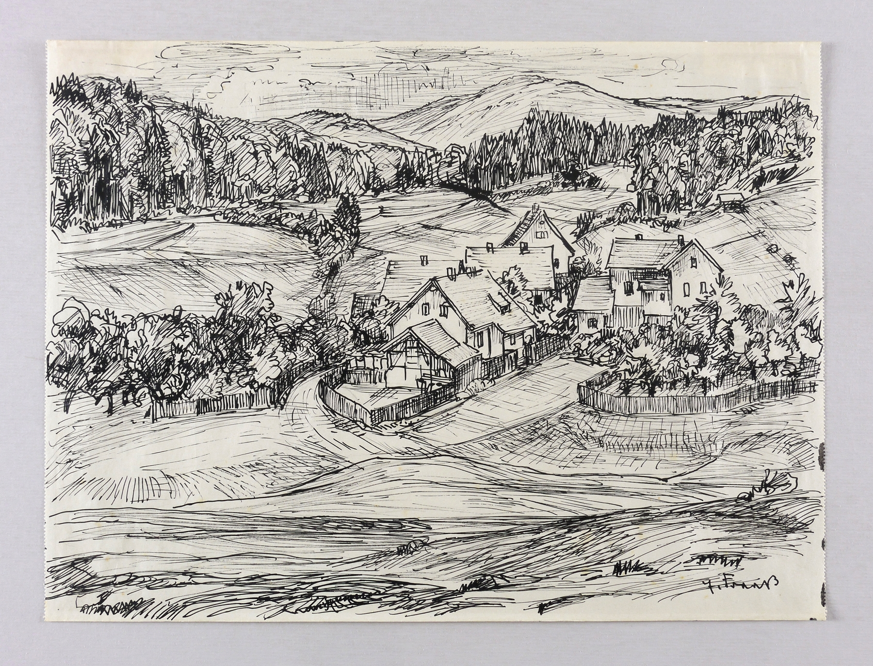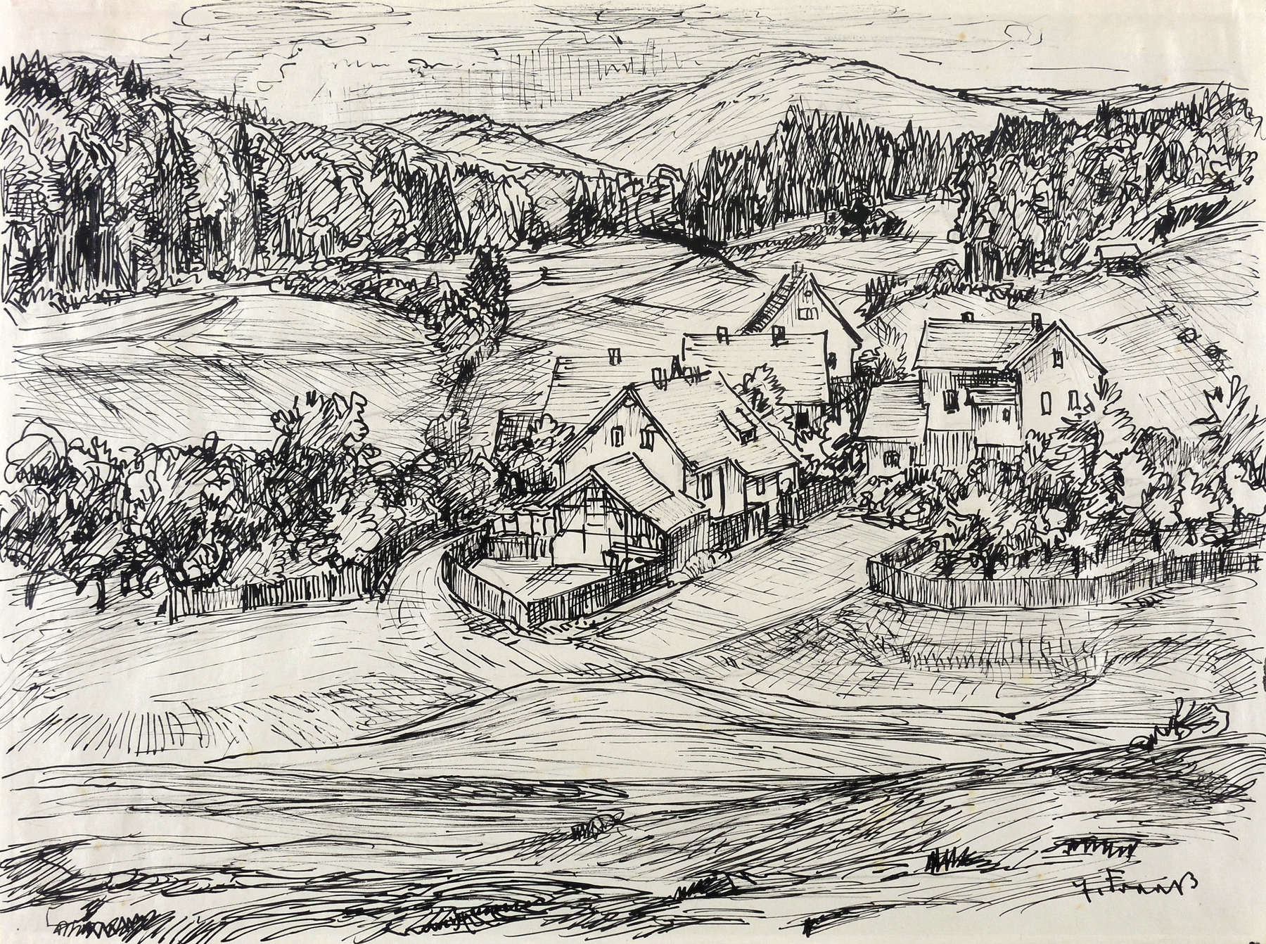 1952. Zeichnung / Federzeichnung, in schwarzer Tusche, auf leichtem hellgelbem Velin. – Originale Künstlergrafik, von Erich Fraaß. – Unikat. – 29,7 x 39,7 cm (Darstellung / Blatt).