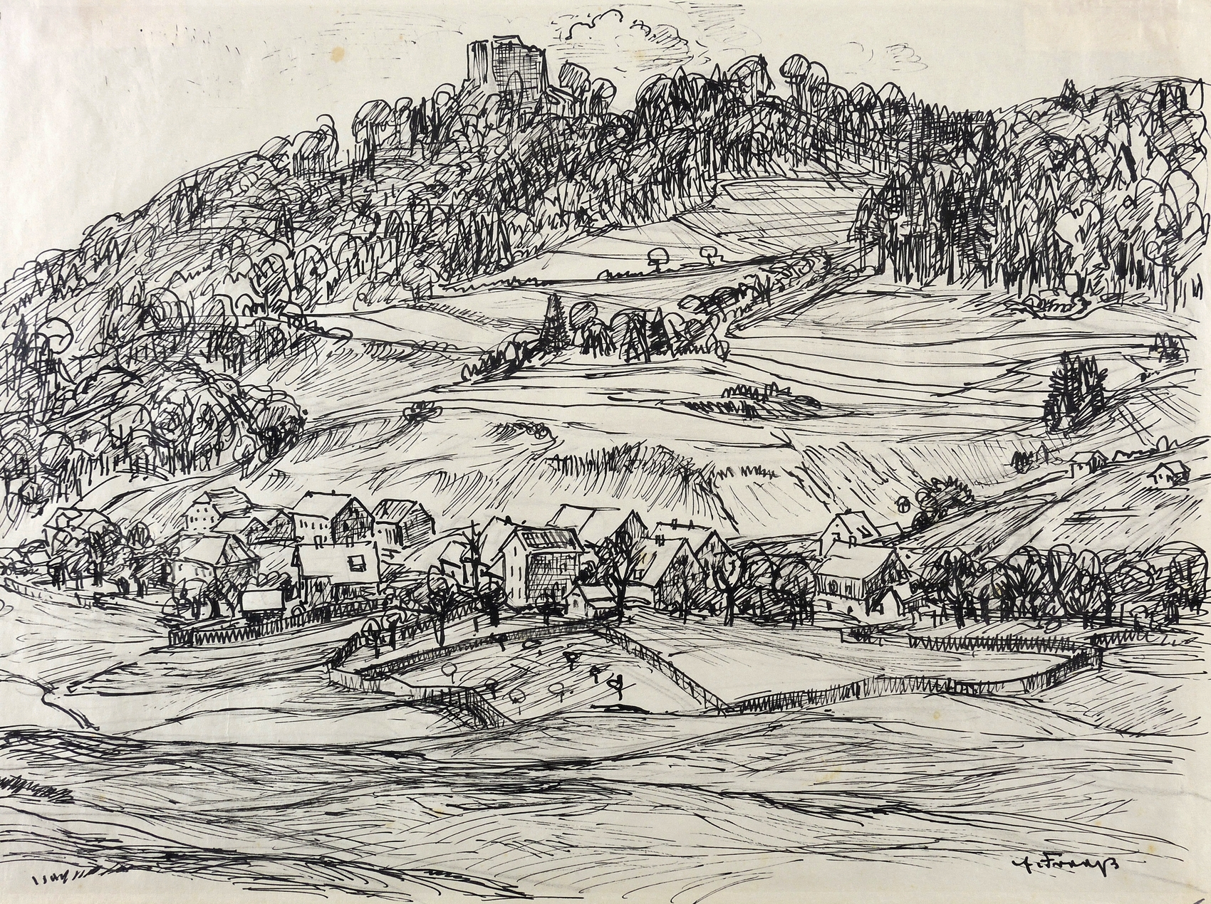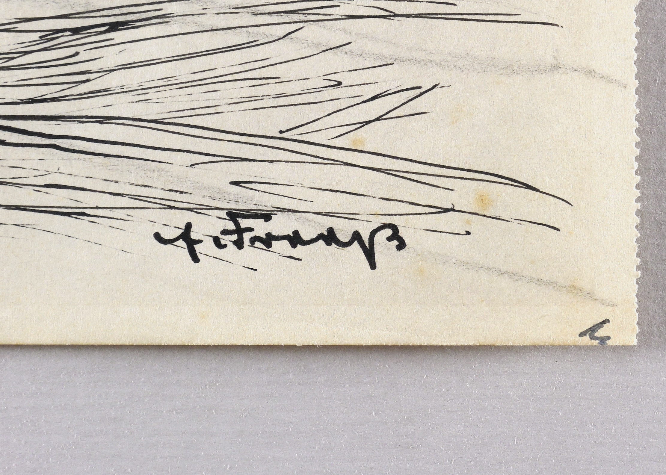 1952. Zeichnung / Federzeichnung, in schwarzer Tusche, auf leichtem hellgelbem Velin. – Originale Künstlergrafik, von Erich Fraaß. – Unikat. – 29,7 x 39,7 cm (Darstellung / Blatt).