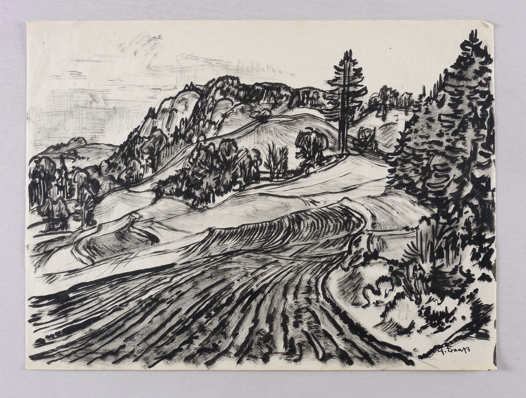 1954. Zeichnung / Pinselzeichnung, in schwarzer Tusche, auf leichtem hellgelbem Velin. – Originale Künstlergrafik, von Erich Fraaß. – Unikat. – 29,7 x 39,7 cm (Darstellung / Blatt).