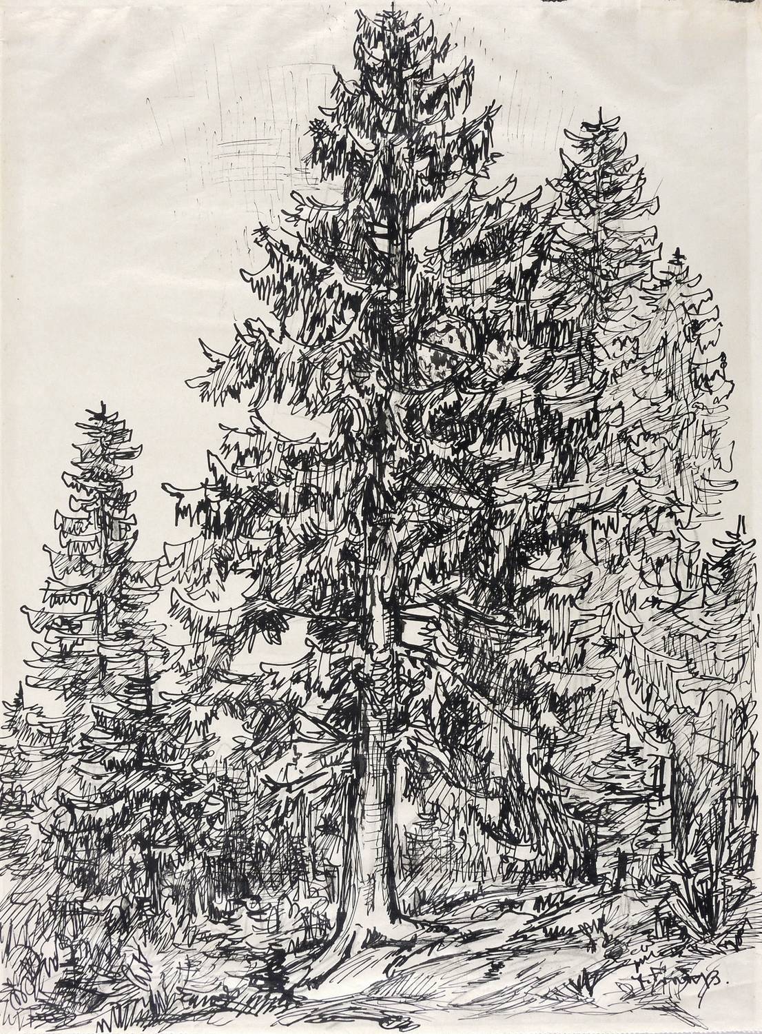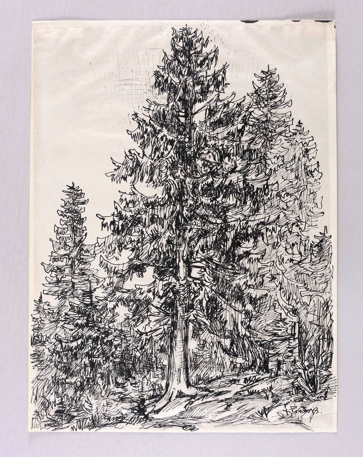 1950-1960. Zeichnung / Federzeichnung, in schwarzer Tusche, auf leichtem hellgelbem Velin. – Originale Künstlergrafik, von Erich Fraaß. – Unikat. – 39,9 x 29,7 cm (Darstellung / Blatt).