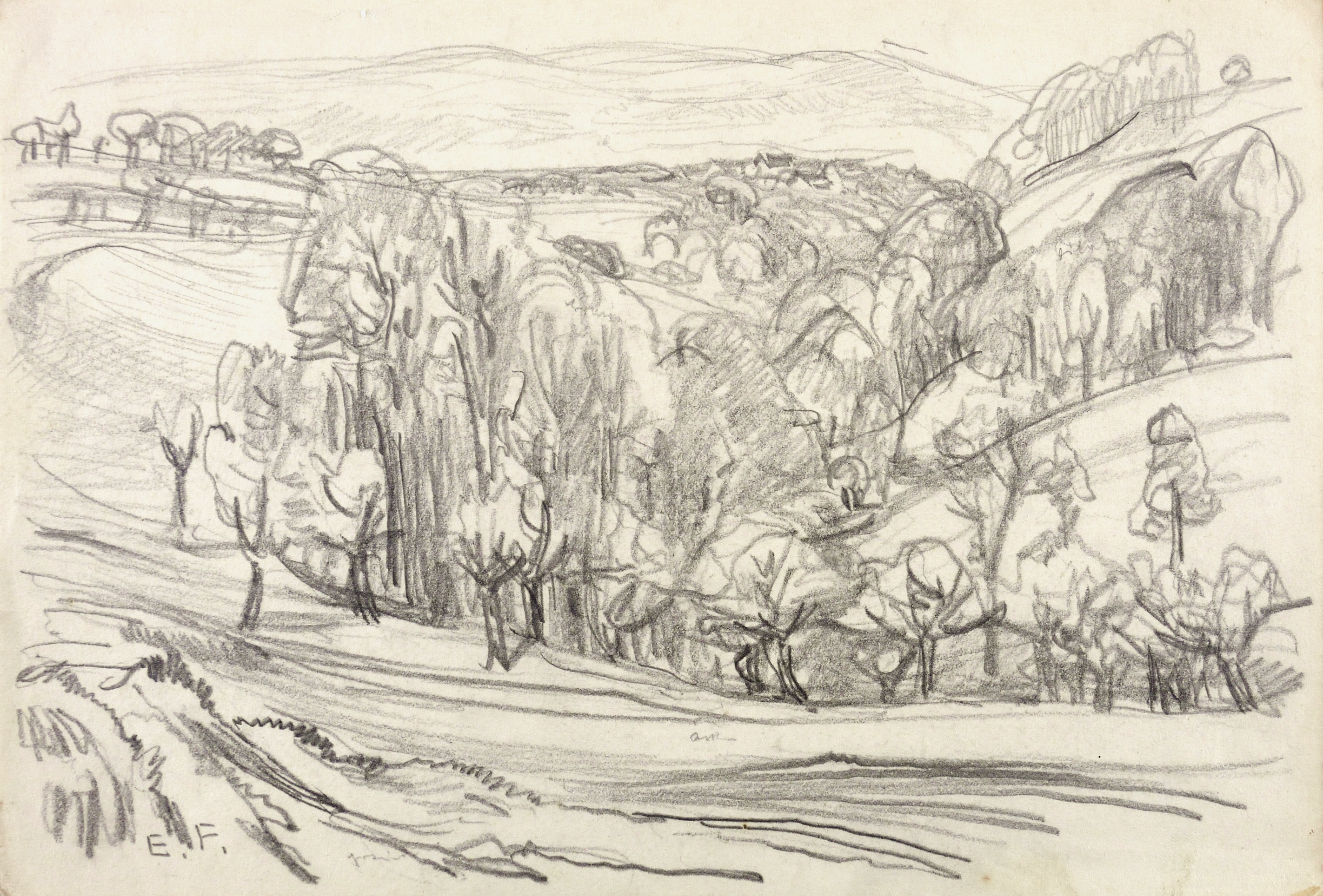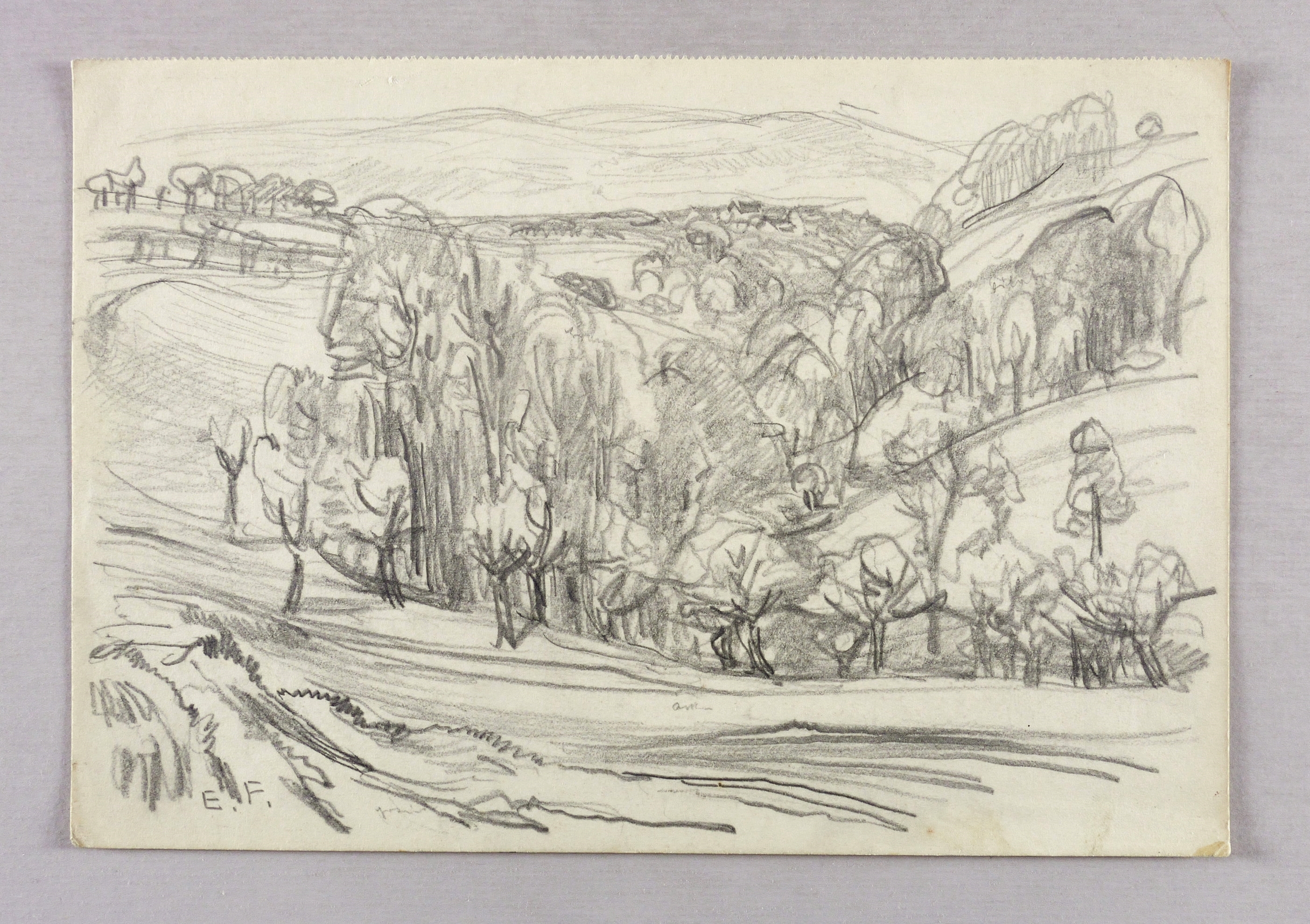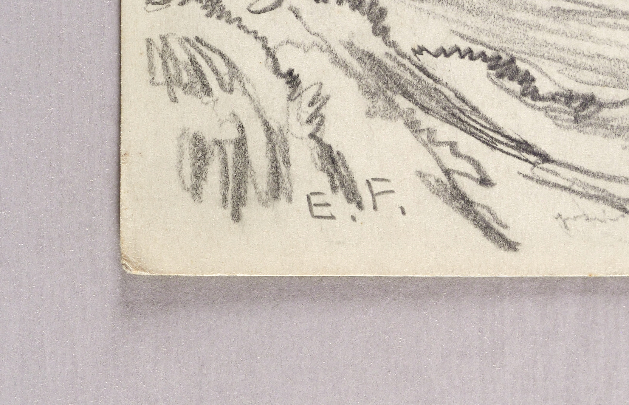 Links unten in Bleistift signiert: ″E.F.″ Verso in Bleistift bezeichnet: ″Gebergrund bei Goppeln / Skizze / 1937/40″. Dazu Nachlass-Stempel Erich Fraaß. – Blattecken unmerklich bestoßen. Sehr guter Zustand.