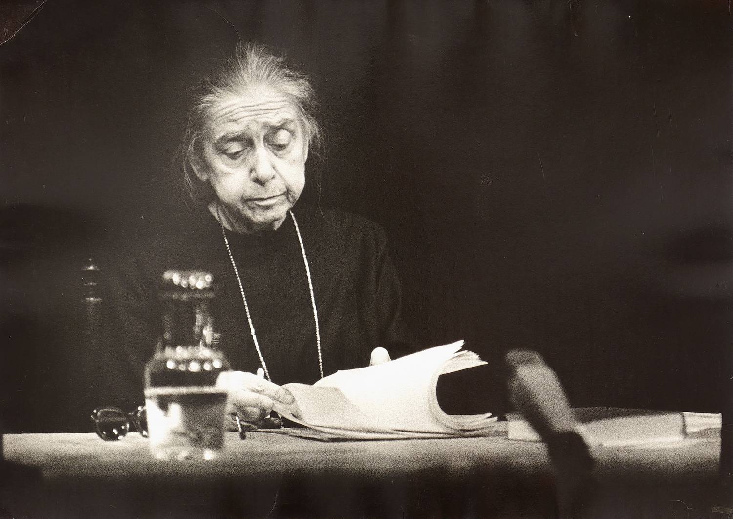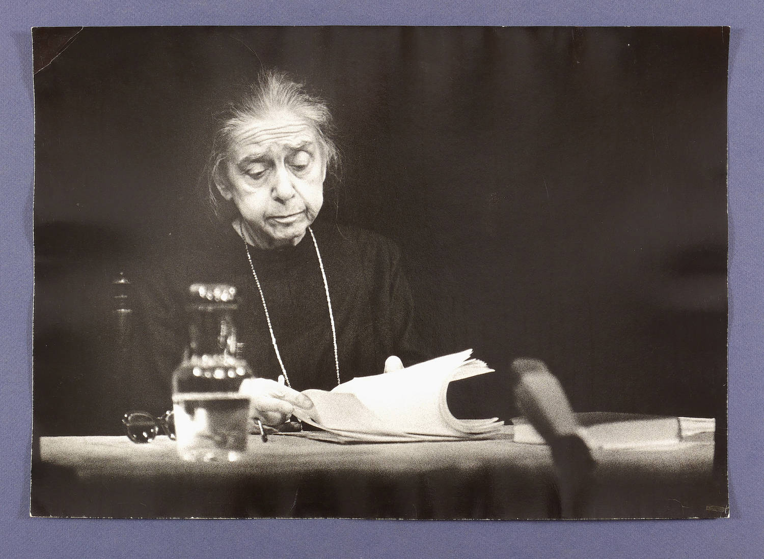 Verso alt in Faserstift bezeichnet. Dazu in Bleistift signiert. – Originalabzug (Vintage print), der nach der Aufnahme von der Künstlerin selbst hergestellt wurde. - Die Aufnahme entstand anlässlich einer Lesung in Ost-Berlin. – Fotopapier im Rand etwas gewellt. Links oben Eselsohr. Insgesamt mäßig guter Zustand.