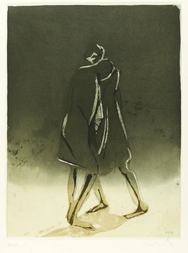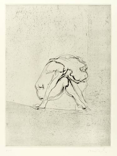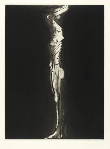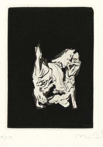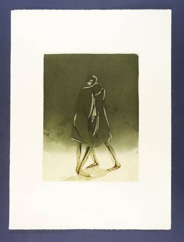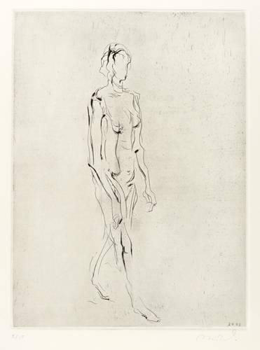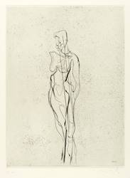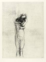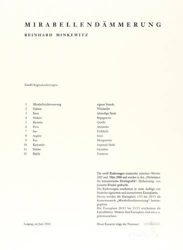 Aus: Reinhard Minkewitz, Mirabellendämmerung (Leipzig: Selbstverlag 2004). – Jedes Blatt mit Signatur, Titel und Auflagenbezeichnung in Bleistift. Dazu jeweils Blindstempel der Presse ROESSLER HOHENOSSIG. – Vollständiges originalgrafisches Mappenwerk mit 8 Radierungen und 4 Farbradierungen, 1 Titel- und 1 Impressum-Blatt. Enthält: 1. Mirabellendämmerung. eigene Stunde. 2. Galene. Windstille. 3. Kore. lebendige Säule. 4. Hekate. Begegnerin. 5. Kastalia. Quelle. 6. Eros. Anzünder. 7. Ino. Frühlicht. 8. Aegina. Insel. 9. Eos. Morgenröte. 10. Karyatide. tragende Säule. 11. Selene. Gezeiten. 12. Skylla. Fresserin. – Komplett mit Leinenmappe in erstklassigem Zustand. Alle Blätter tadellos erhalten. Sehr guter Zustand.
