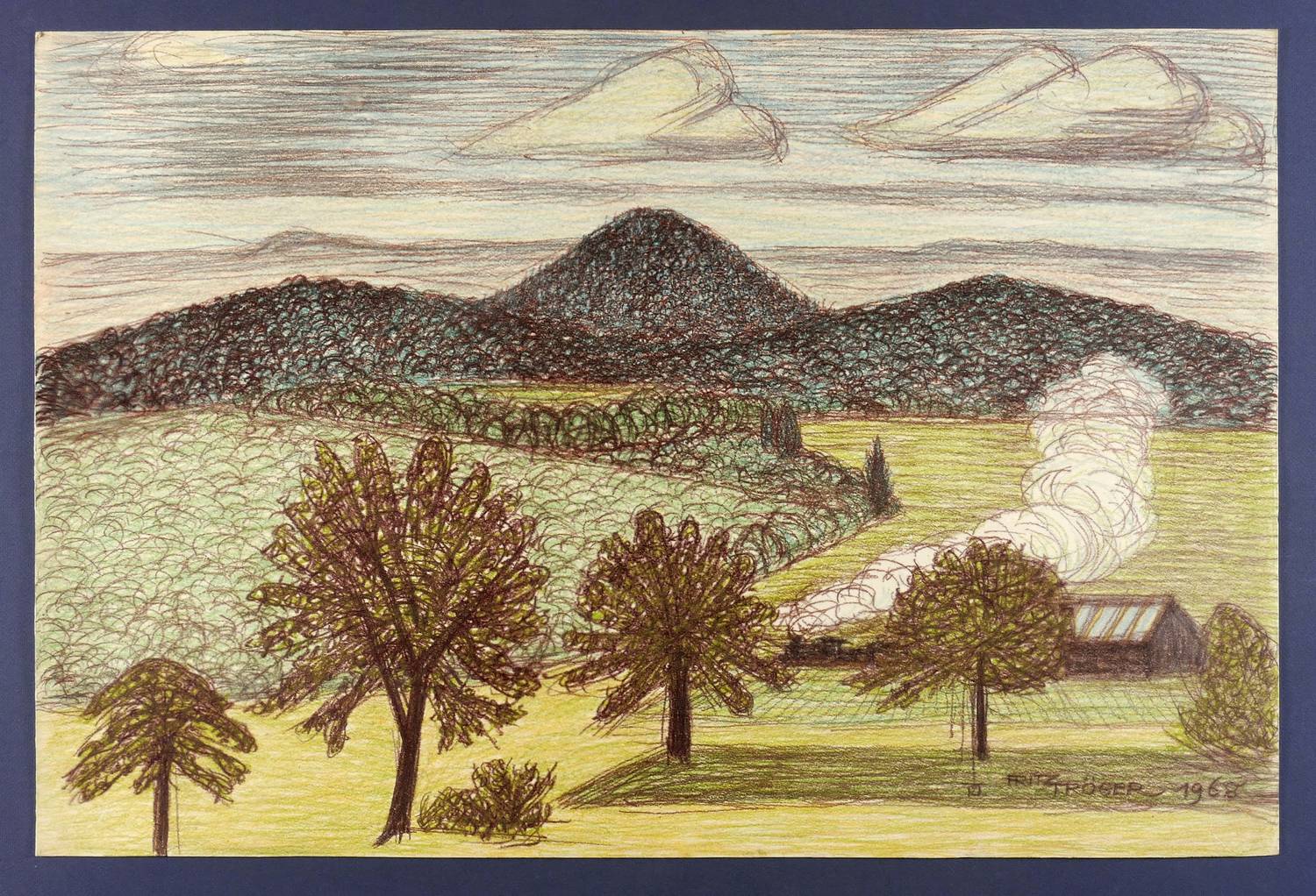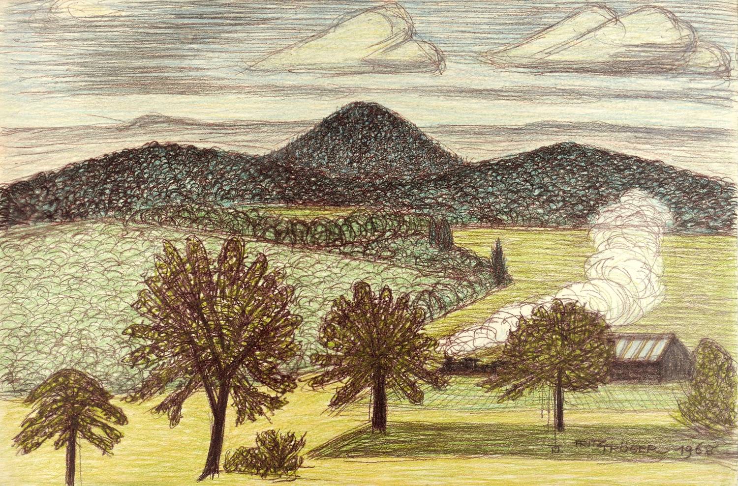 1968. Mischtechnik / Kreide & Pastellmalerei, auf hellgelbem Karton. – Originale Künstlergrafik, von Fritz Tröger. – Unikat. – 50,0 x 75,1 cm (Darstellung / Blatt).