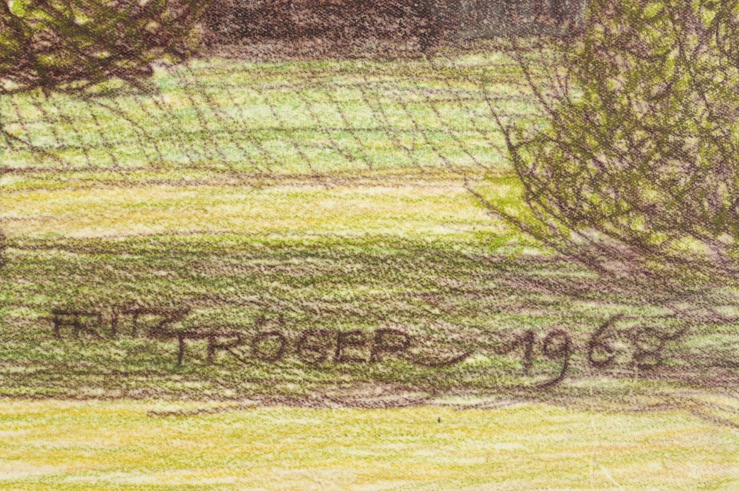 Fritz Tröger (1894 Dresden - 1978 Dresden). Deutscher Maler und Grafiker. Namhafter Vertreter der Neuen Sachlichkeit. 1914-18 Studium an der Kunstgewerbeschule in Dresden bei Paul Rößler und Margarete Junge. 1918-25 Studium an der Dresdner Akademie bei Max Feldbauer, Otto Gussmann, Otto Hettner und Georg Lührig. Ab 1925 freischaffender Maler in Dresden. Danach Studienreisen nach Italien, Frankreich, Spanien, Portugal, Österreich und nach Böhmen. 1928-30 Lehrer für Modezeichnen an der Kunstschule Guido Richter, 1929-35 Lehrer an der Heeres-Handwerker-Schule Dresden. 1929-33 Versuche mit keramischer Wandmalerei bei Teichert in Meißen. Gründungsmitglied der "Dresdner Sezession 1932". 1936 Rückzug in das Landatelier in Laske bei Kamenz. 1943-45 Ausstellungsverbot. 1947 Mitglied der Dresdner Künstlergemeinschaft "Das Ufer". 1950er und 1960er Jahre verstärkt Arbeit in landwirtschaftlichen und industriellen Betrieben sowie im Tagebau. 1954 Sonderausstellung im Albertinum in Dresden. 1955 und '61 Paris-Reisen. Tröger schuf Bildnisse, Landschaften und Industriedarstellungen in Öl, Pastell und Keramik.