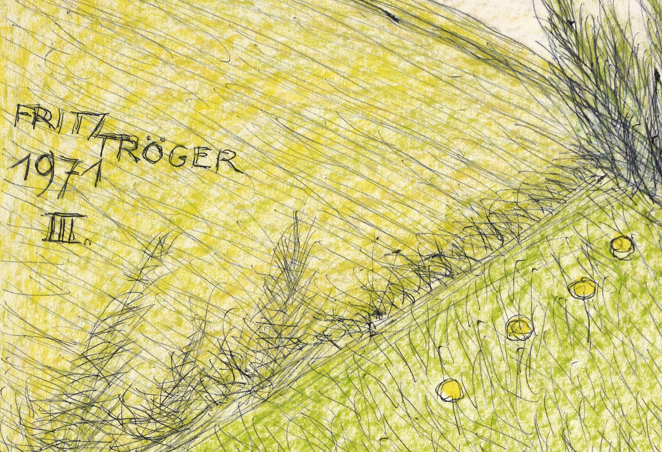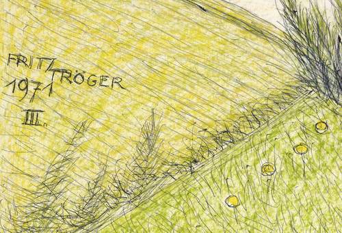 1971. Mischtechnik / Kugelschreiber & Wachsfarbe, auf glattem weißem Karton. – Originale Künstlergrafik, von Fritz Tröger. – Unikat. – 49,9 x 70,1 cm (Darstellung / Blatt).