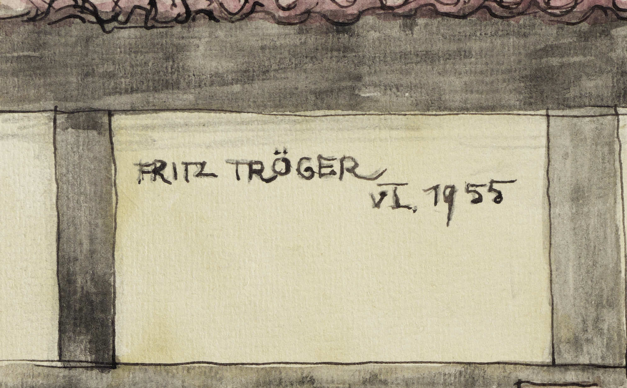 1955. Mischtechnik / Aquarell & Federzeichnung, über Bleistift, auf Zeichenpapier. – Originale Künstlergrafik, von Fritz Tröger. – Unikat. – 20,9 x 27,8 cm (Darstellung / Blatt).