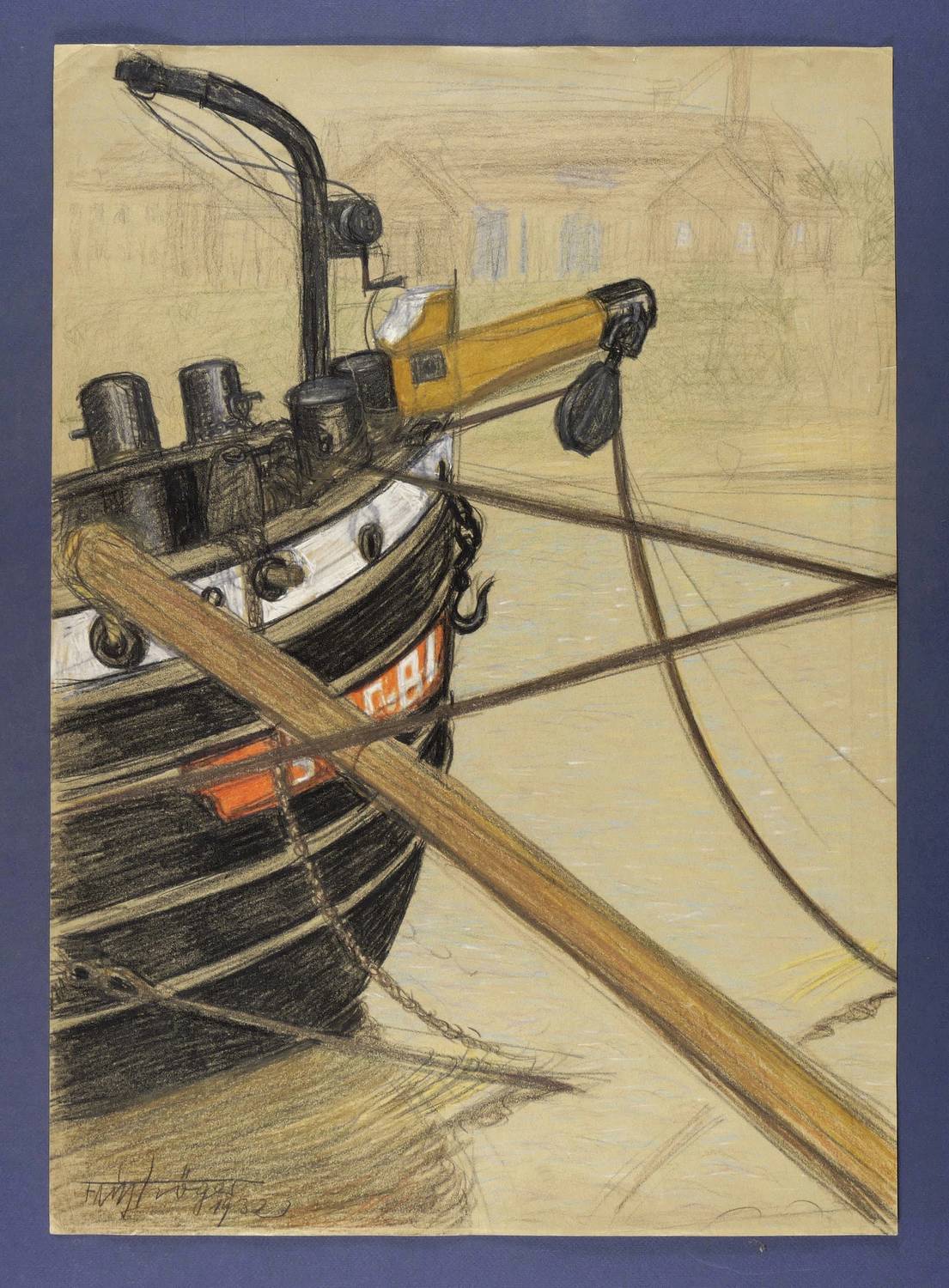 Links unten in schwarzer Kreide signiert und datiert: ″Fritz Tröger / 1932″. Verso in schwarzer Feder nochmals signiert und bezeichnet: ″Elbzille (Ölkreide)″. In Bleistift Qualitätssigel: ″XXX″. – Geringfügige Randmängel. Leichte Montagespuren. Insgesamt guter Zustand.