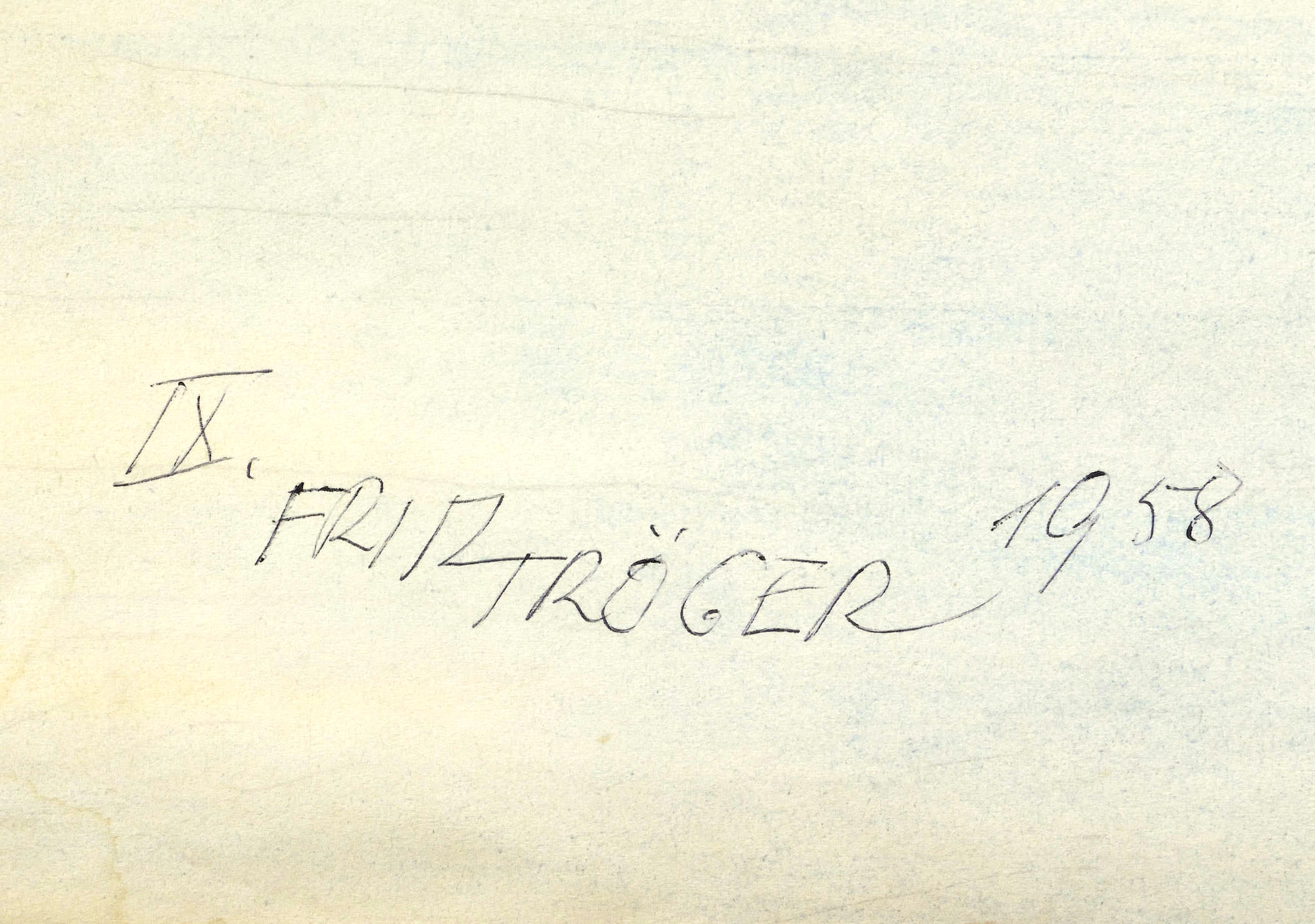 1958. Mischtechnik / Feder & Pastellkreide, auf glattem gelblichem Karton. – Originale Künstlergrafik, von Fritz Tröger. – Unikat. – 53,3 x 63,0 cm (Darstellung / Blatt).