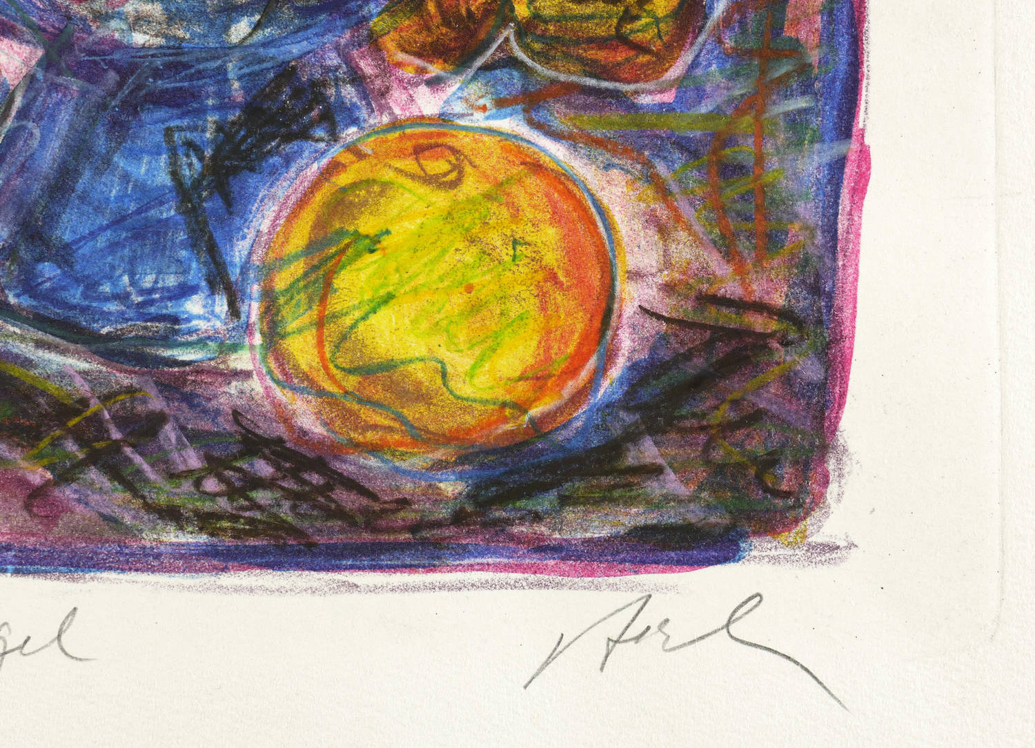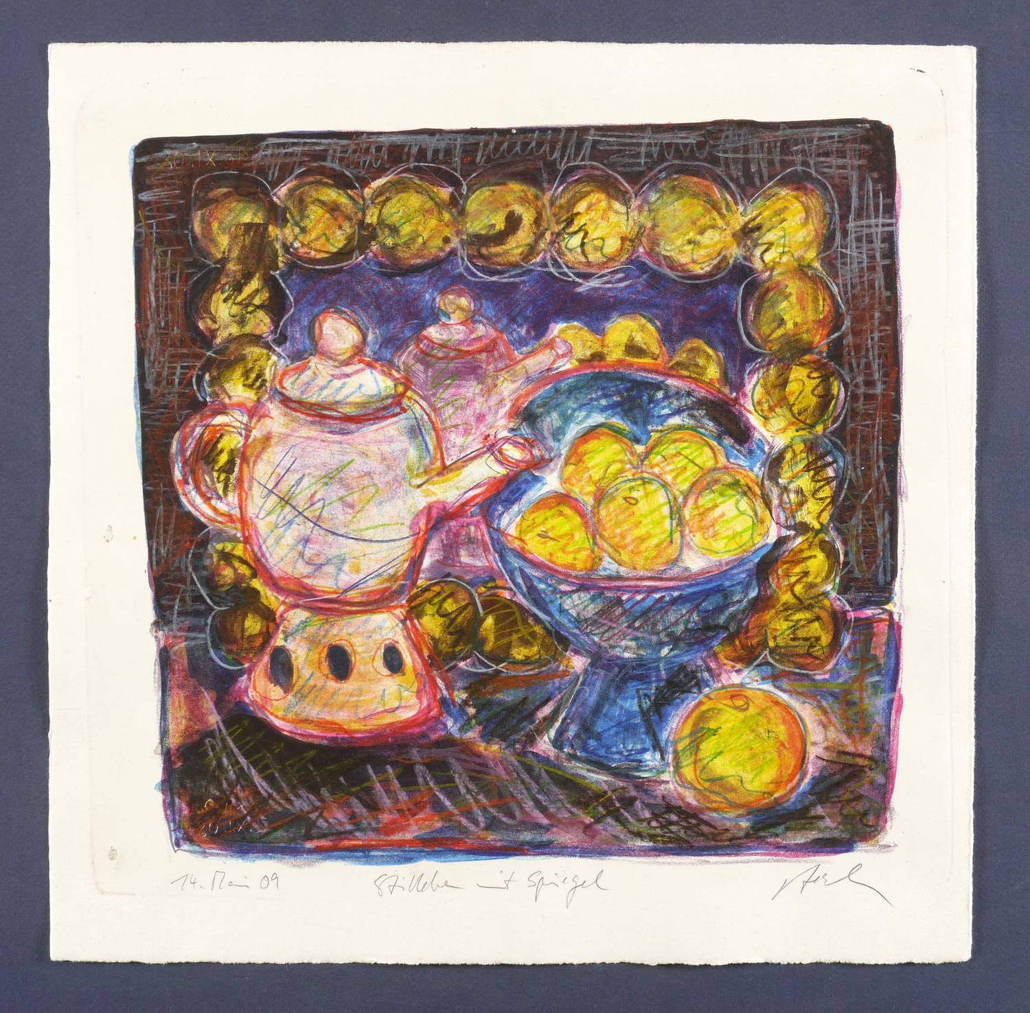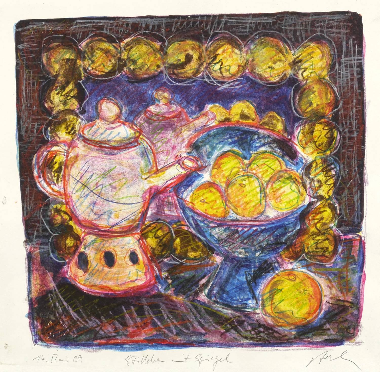 2009. Farblithografie / Kreidelithografie, mit Farbstiften überarbeitet, auf gelblichem Hahnemühle-Bütten. – Originale Künstlergrafik, von Silvio Zesch. – Unikat. – 31,5 x 33,0 cm (Darstellung), 36,0 x 37,0 cm (Stein), 39,5 x 40 cm (Blatt).