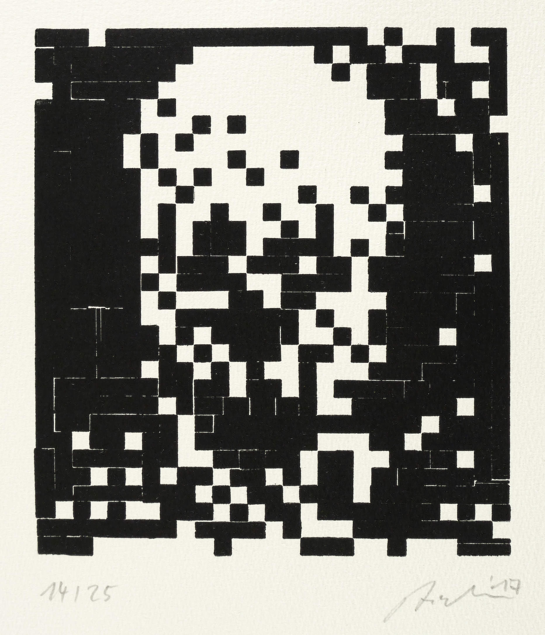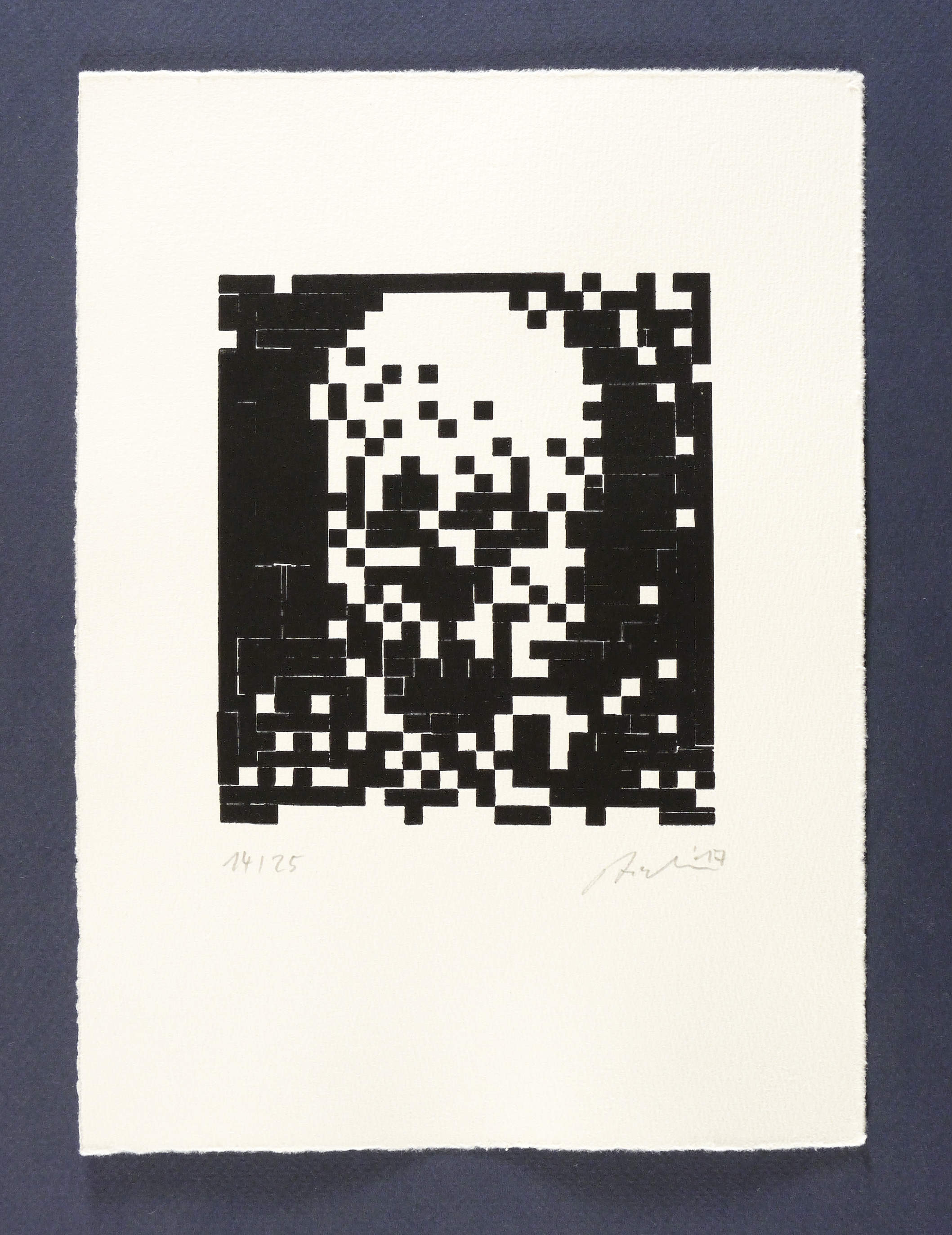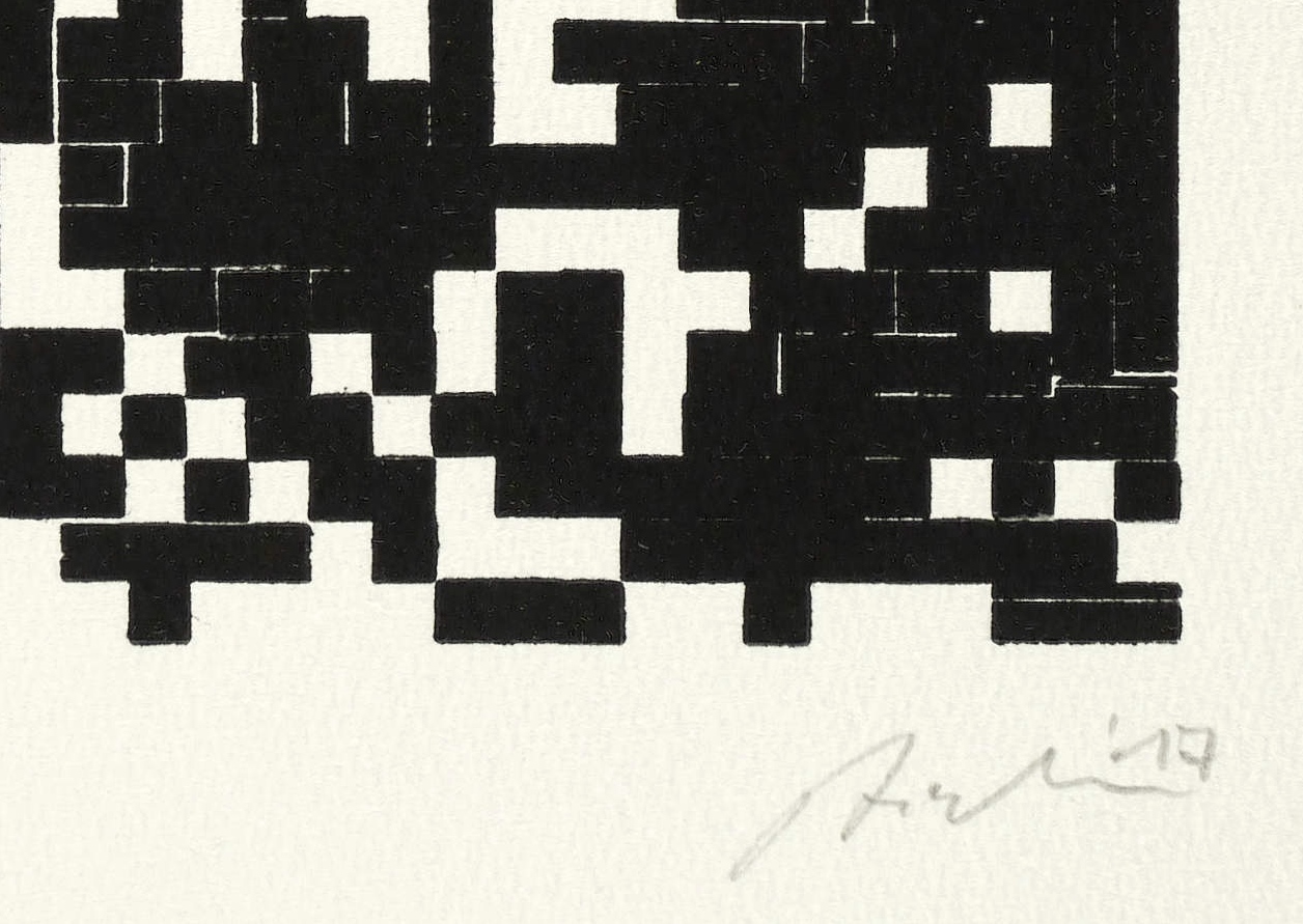 Unten rechts in Bleistift signiert und datiert. Links Auflagenbezeichnung. – Experimentelle Umdeutung des Holzschnitts, bei dem kleine Holzquader wie im klassischen Typensatz dem Muster eines groben Computerrasters folgend zu einer Druckform zusammengesetzt werden. – Tadelloses Exemplar.