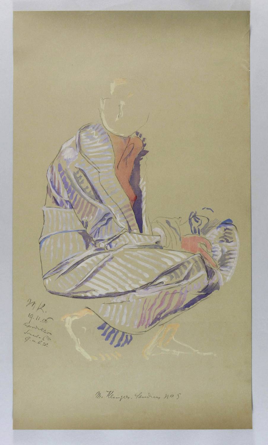 Aus: Max Klinger, Zwanzig Studien zu Bildern, Plastiken und Stichen (Leipzig: Selbstverlag 1914). – Links am Rand Monogramm und Datum. In der Darstellung links unten bezeichnet: ″M. Klingers Studien No. 5″. – Blatt Nr. 5 der aufwändig hergestellten Studien-Mappe mit 20 Farblichtdrucken nach Zeichnungen zu diversen Plastiken und Wandgemälden. Sie wurde von der Graphischen Kunstanstalt Sinsel & Co in Leipzig in einer hochwertigen Auflage von 250 Stück gedruckt und von der Galerie Ernst Arnold in Dresden vertrieben. 2013 widmete das Max-Klinger-Haus Naumburg ihr eine Ausstellung. - Eines von 250 Exemplaren. – Farbfrisch. Links oben im Rand unshceinbare Knickspur. Insgesamt guter bis sehr guter Zustand.