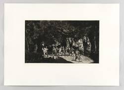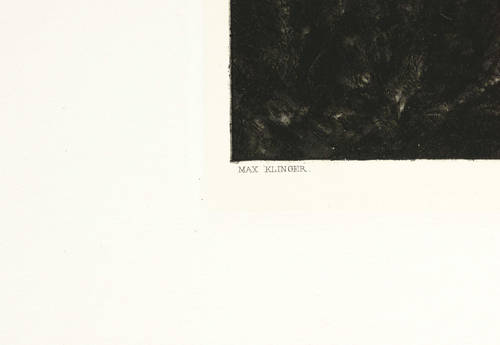 1881. Radierung / Strichätzung, in Schwarz, auf gewalztem China, auf Kupferdruckpapier. – Originale Künstlergrafik, von Max Klinger. – 23,5 x 40,5 cm (Darstellung / Einfassungslinie), 26,8 x 42,8 cm (Platte), 45 x 63 cm (Blatt).