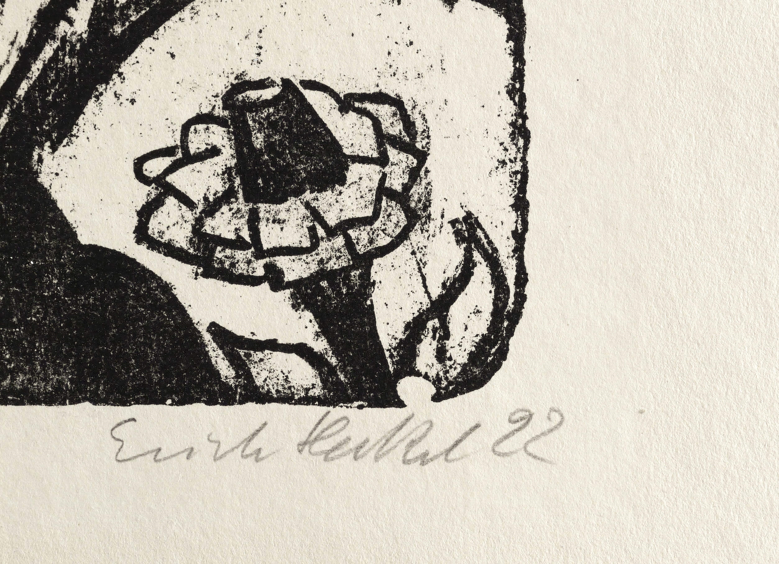 Dube L 269 a (von b). – Rechts unten in Bleistift signiert und datiert: ″Erich Heckel 22″. Dazu in der Blattecke links unten betitelt: ″Mädchenkopf″. – Früher Abzug vor der Auflage von 100 Exemplaren für die Mappe ″Deutsche Graphiker″ von Arno Holz (1923). Deshalb der Titel abweichend von der späteren Edition. – Originalrandiges Exemplar, oben und links Schöpfrand. Tadellos. Schönes Erscheinungsbild. Exzellenter Erhaltungszustand.