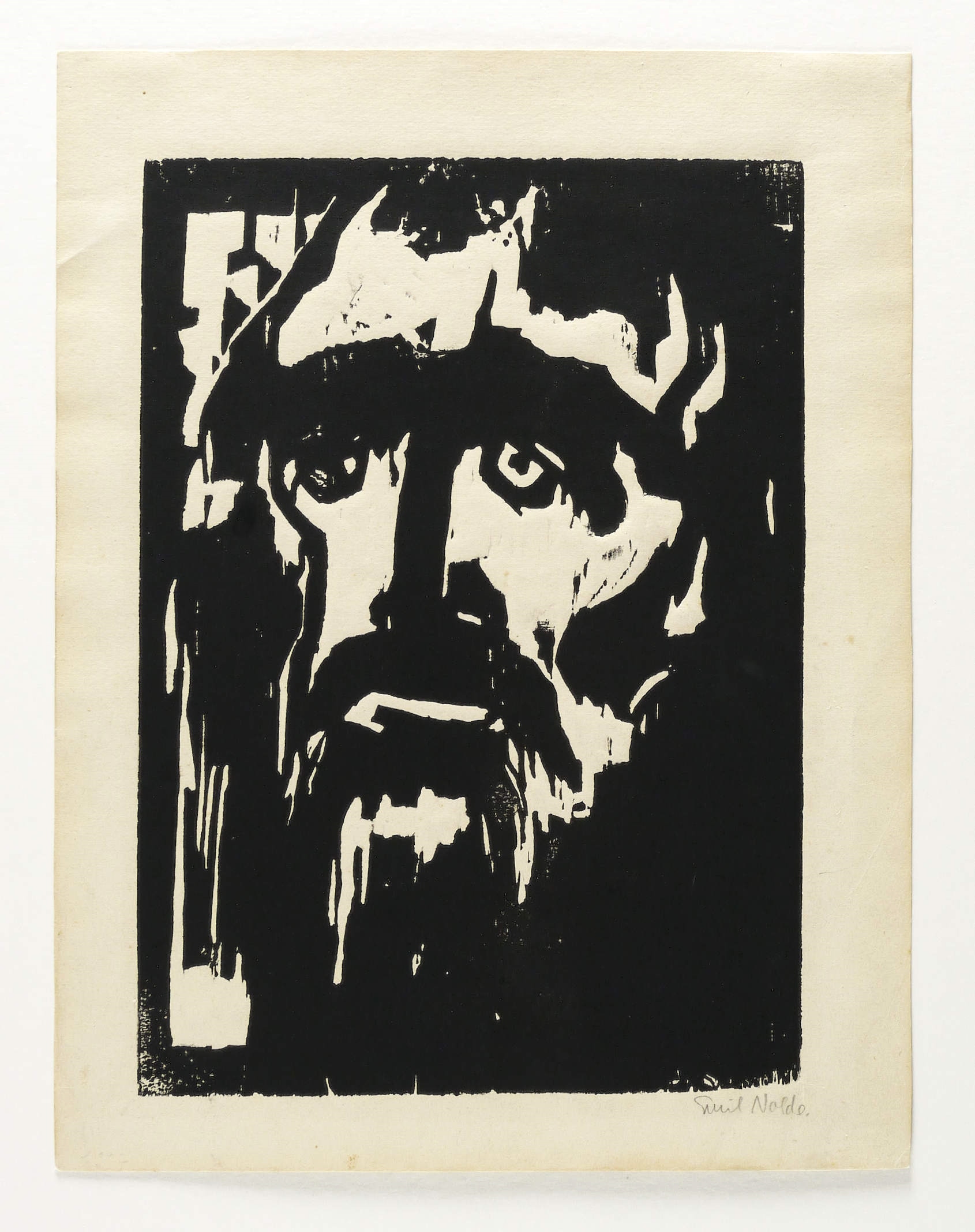 Schiefler-Mosel 110. – Rechts unten in Bleistift signiert: ″Emil Nolde″. – Hauptwerk der Grafik des deutschen Expressionismus. Von Werner Haftmann als ″dramatische Ikone″ hervorgehoben (Vgl. Haftmann, Holzschnitte von Emil Nolde, Bremen 1947). - Einer von reichlich 20 Abzügen. - Satter kontrastreicher Druck, mit deutlichen Reibespuren und starkem Relief auf der Rückseite. – Papier mit leichten Altersspuren und wenigen Fleckchen. Verso Reste einer ehemaligen Montierung. Fachgerecht im Passepartout montiert. Insgesamt guter Erhaltungszustand.