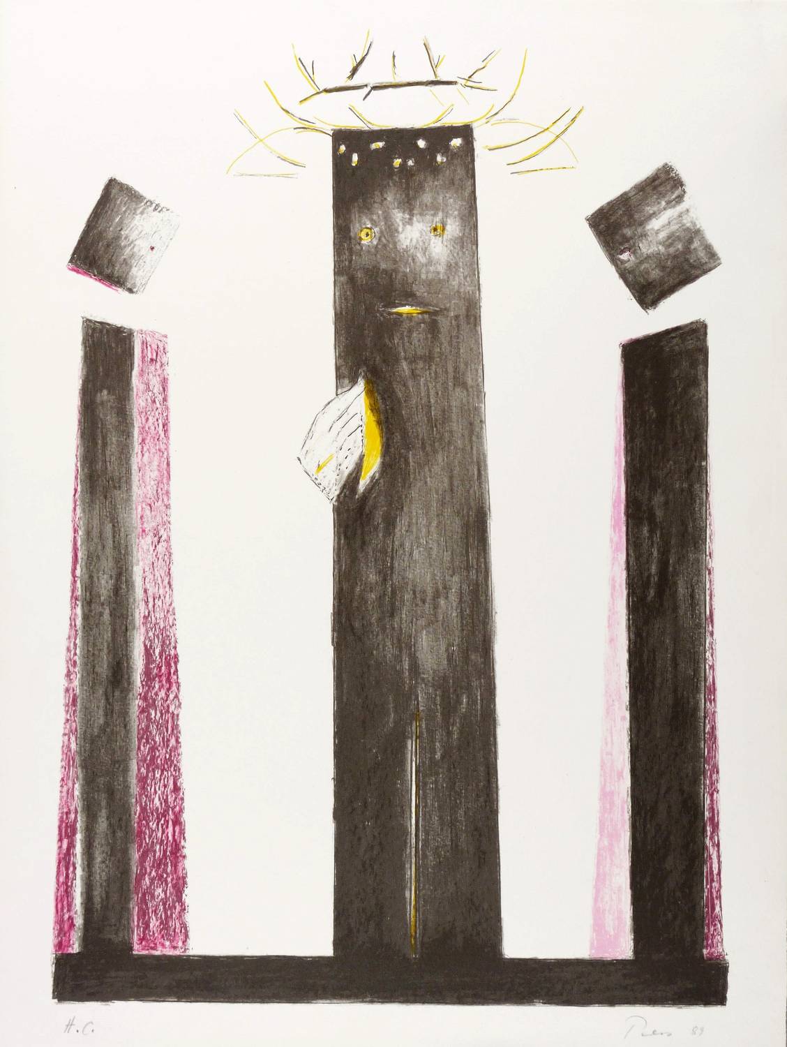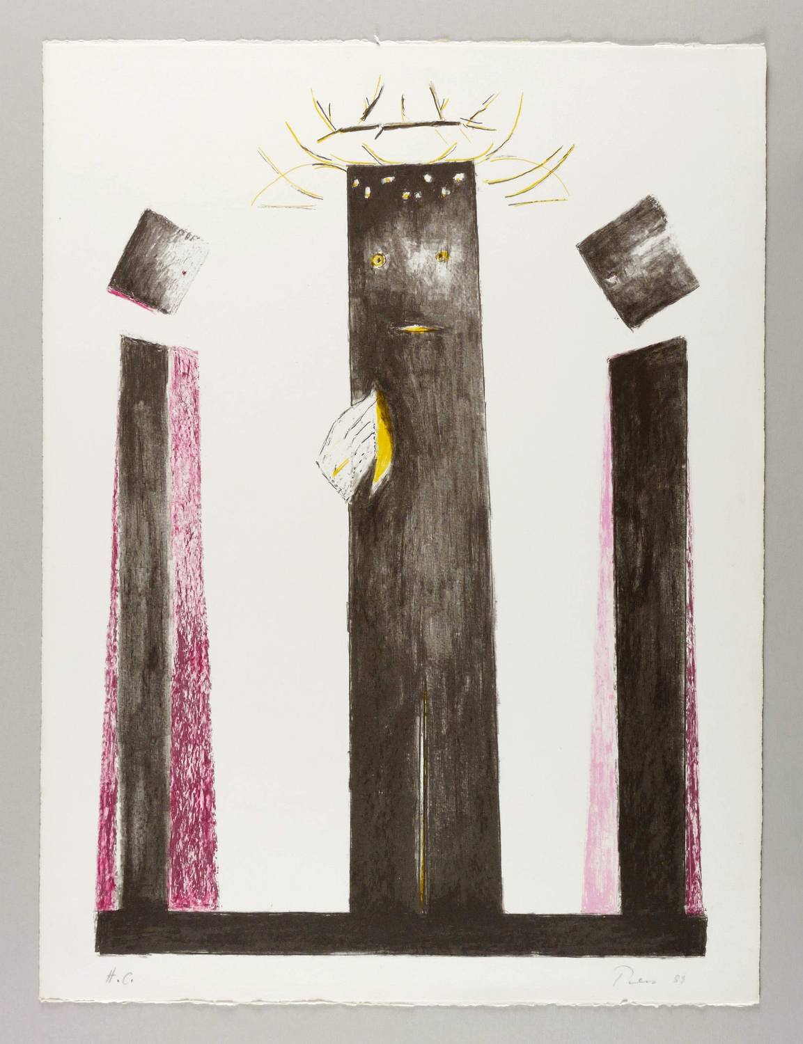 1989. Farblithografie / Kreide- & Pinsellithografie, in 6 Farben, auf kräftigem hellchamois BFK-Rives-Bütten. – Originale Künstlergrafik, von Friedrich Press. – 60,4 x 42,3 cm (Darstellung / ohne Schrift), 67 x 50 cm (Blatt).