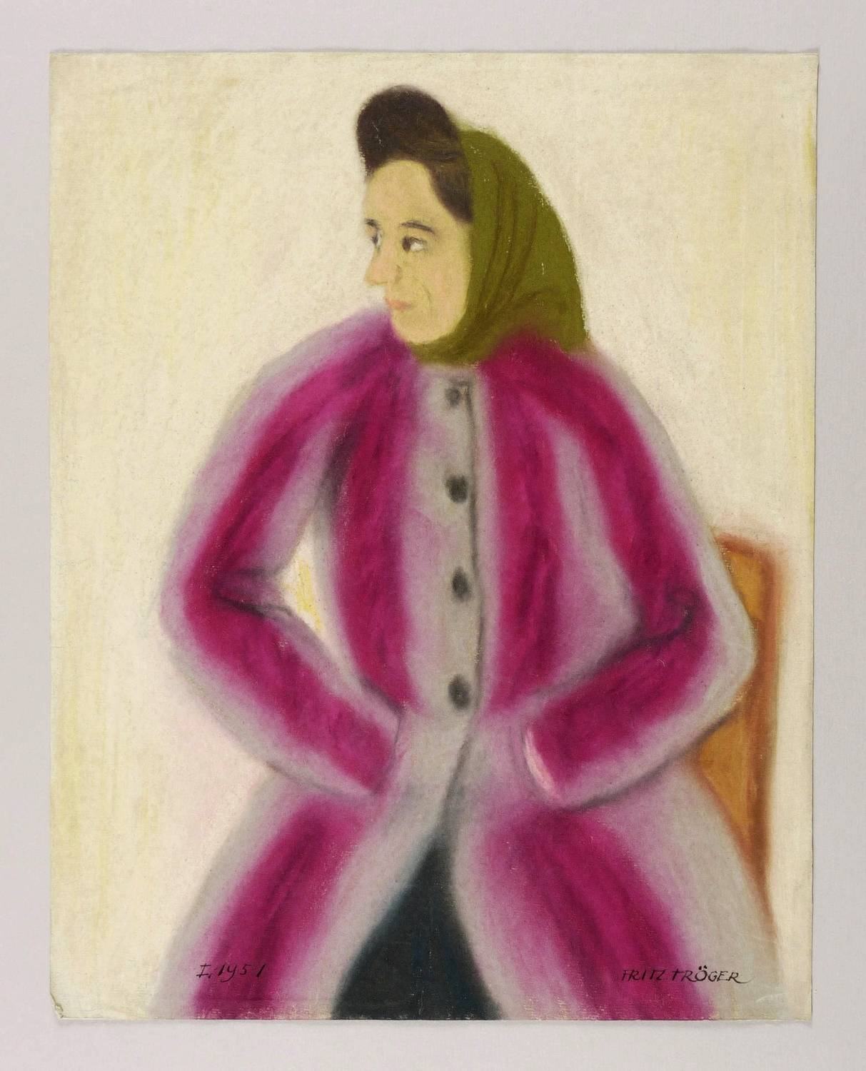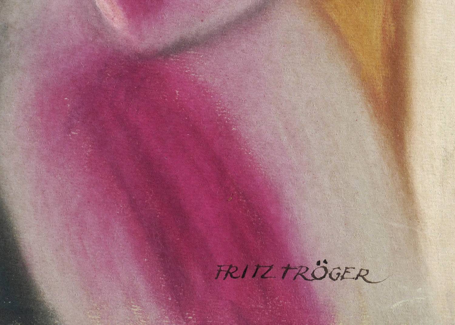Rechts unten in schwarzer Feder signiert: ″FRITZ TRÖGER″. Links datiert: ″I.1951″. Verso in Bleistift und nochmals in schwarzer Feder bezeichnet, u.a.: ″Sitzende Frau (Pastell)″. – Kleiner Randriss im unteren rand hinterlegt. Insgesamt guter Zustand.