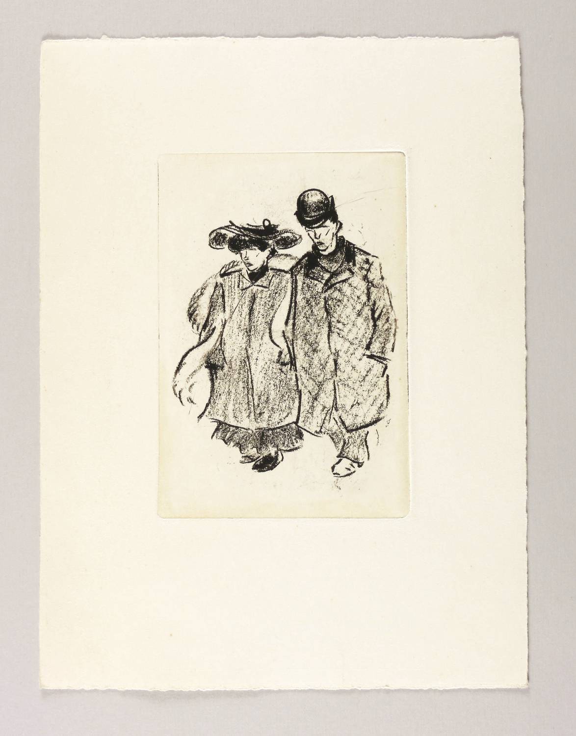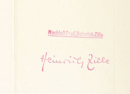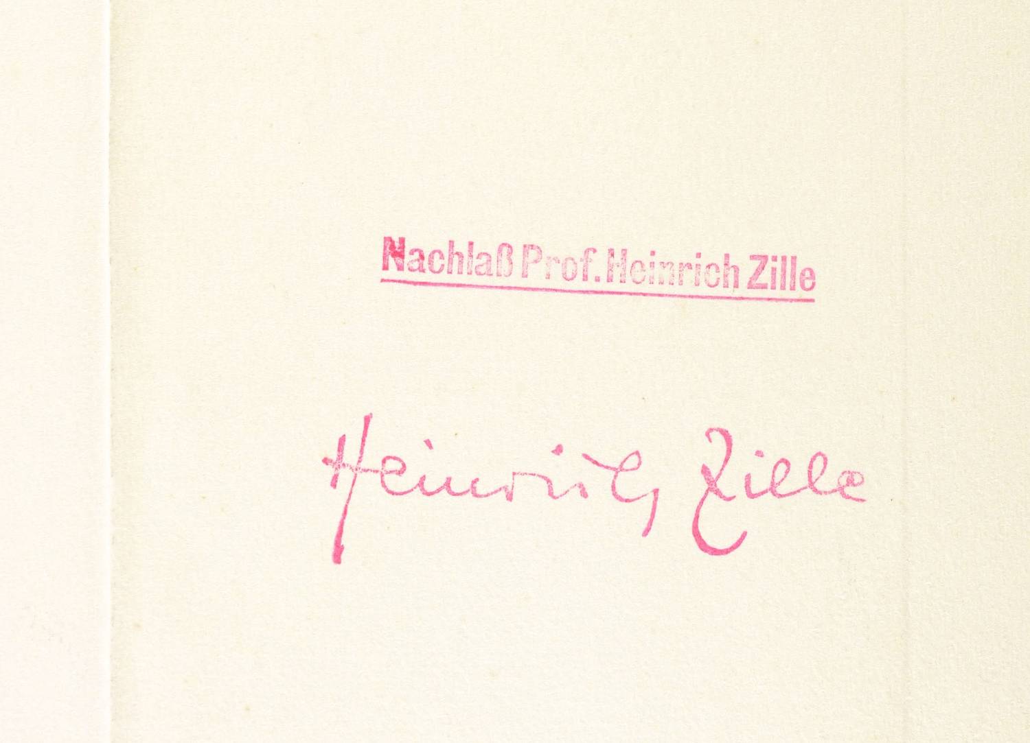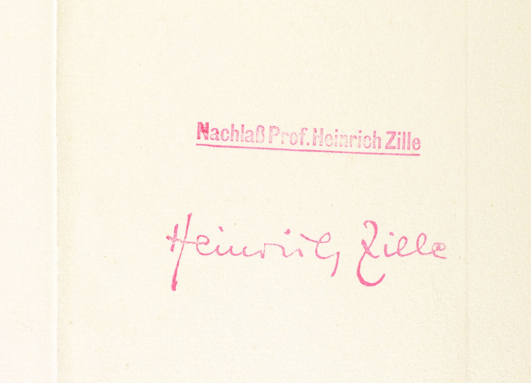 Rosenbach 42 a (von d). – Nicht handsigniert. Verso Stempel mit Namenszug Heinrich Zille in Rot (Lugt 2676 b, Rosenbach Stempel 1). Dazu weiterer Stempel in Rot: ″Nachlaß Prof. Heinrich Zille″ (nicht bei Lugt, Rosenbach Stempel 4). – Variante A des Motivs der ″Spaziergänger″ laut Werkverzeichnis, hier römisch I. – Unsignierter Probedruck aus dem vom Sohn Walter Zille verwalteten Künstlernachlass. – Ohne Tadel. Sehr guter Zustand.