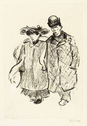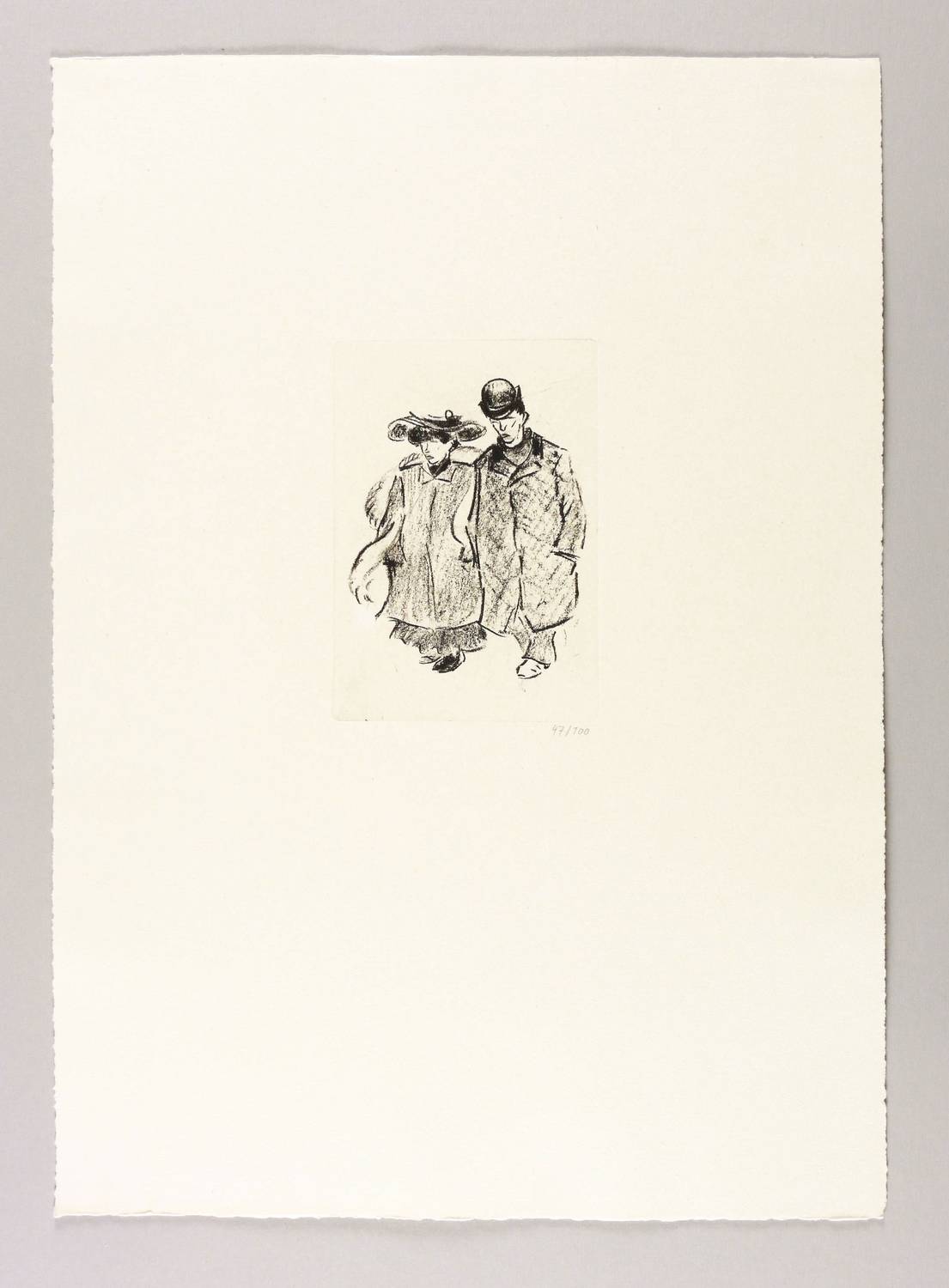 Rosenbach 42 b (von d). – Aus: Heinrich Zille, Zehn Original-Graphiken aus dem Nachlass (Hannover: Fackelträger-Verlag 1964). – Nicht handsigniert. Rechts unten in Bleistift Auflagenbezeichnung: ″47/100″. – Variante A des Motivs der ″Spaziergänger″ laut Werkverzeichnis, hier römisch I. – Posthumer Abzug von der im Nachlass erhaltenen originalen Platte für die 1964 in einer Auflage von 100 Exemplaren im Fackelträger-Verlag Hannover erschienene Mappe mit zehn Zille-Drucken. – Vollrandiges Exemplar. Tadellos. Sehr guter Zustand.