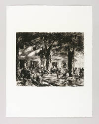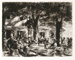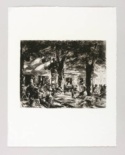 Schiefler 35 IV (von IV) b 2. – Aus: Pan (Berlin: Fontane 1895), Bd. 1. – Nicht handsigniert. Verso in Bleistift bezeichnet: ″Max Liebermann - Kellergarten Rosenheim - 1895 - Orig-Rad.″ – Im Mai 1893 entstanden bei einem Aufenthalt der Familie Liebermann im oberbayrischen Dorf Brannenburg bei Rosenheim als Zeichnungen, Ölstudien und Gemälde mehrere Fassungen von ″Biergarten in Brannenburg″, auf die auch die Radierung von 1895 zurückgeht. Gustav Schiefler beschrieb sie so: ″Ein Biergarten, in welchem unter Bäumen an den Tischen das Publikum sitzt. Sonnenstrahlen fallen durch das Laubdach und zeichnen helle Flecken auf den Erdboden, die Tische, die Menschen. Im Hintergrunde das Wirtschaftsgebäude.″ (WVZ Schiefler, S. 45). – Unbeschnittenes Exemplar. Frei von Mängeln. Sehr guter Zustand.