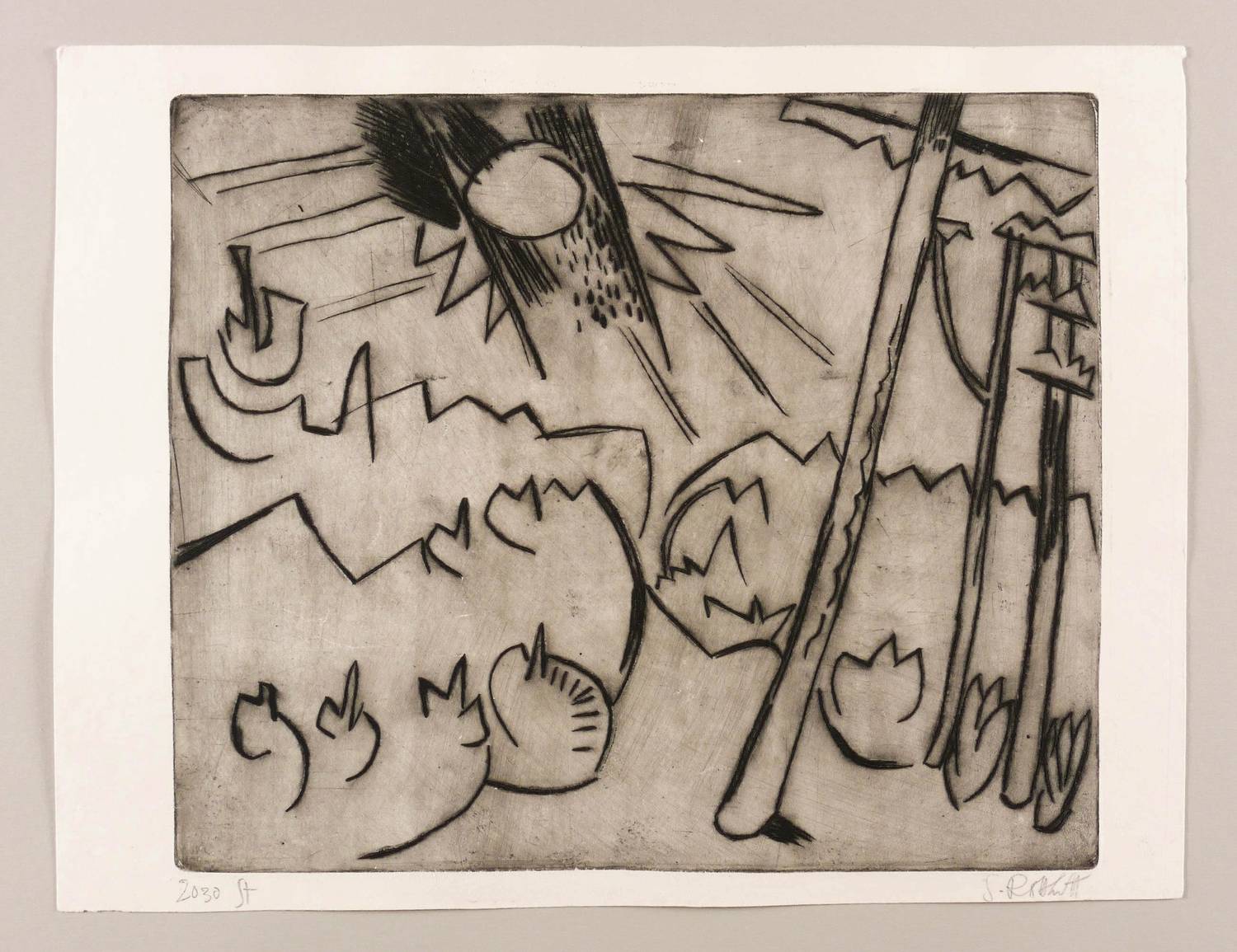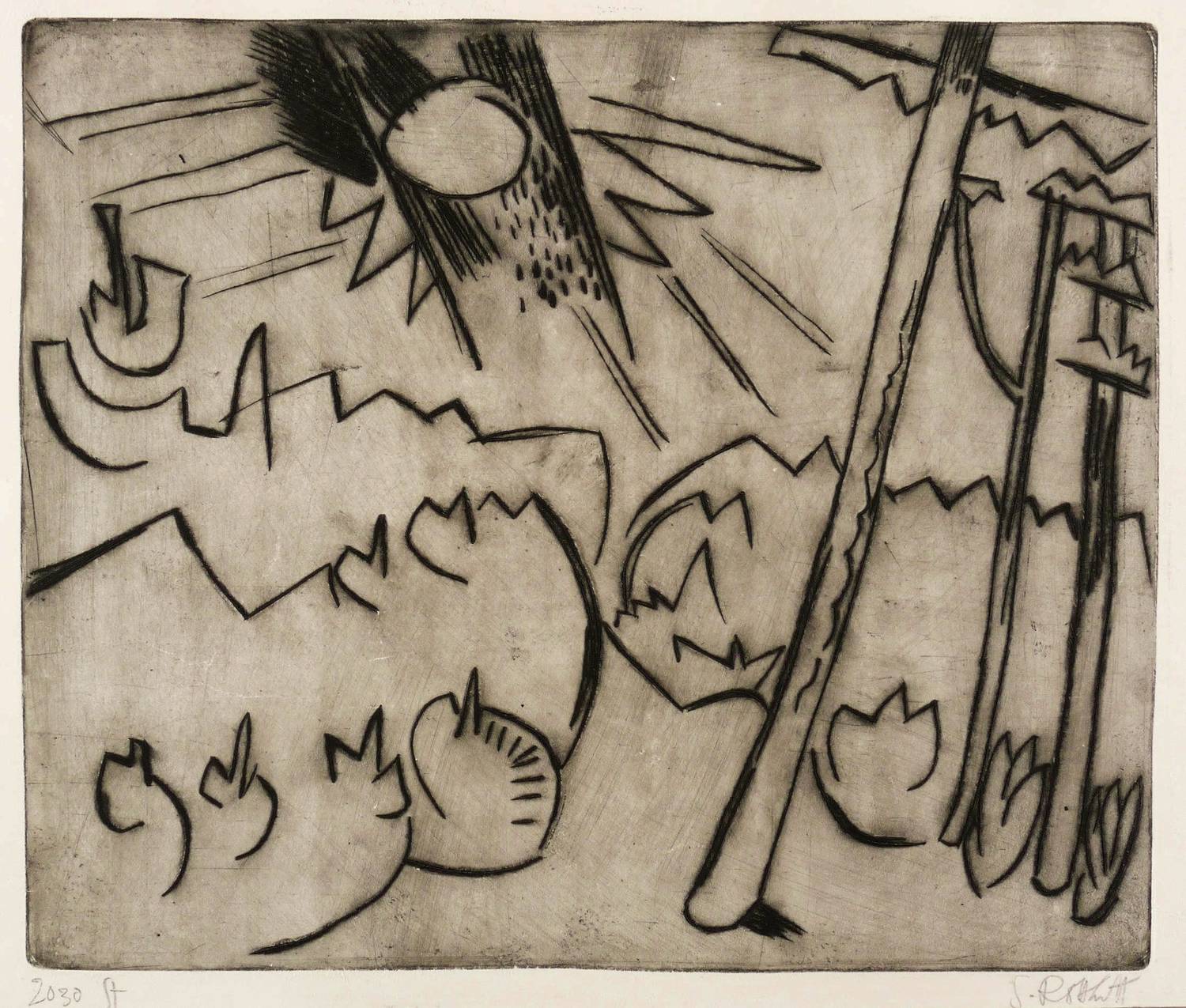 Schapire R 44. Voigt 2030. – Rechts unten in Bleistift signiert: ″S Rottluff″. Links eigenhändige Werknummer: ″2030 St″. – Originale Kaltnadelradierung auf Zinkplatte. Druck von Fritz Voigt, Berlin. - Die Beschreibung bei Rosa Schapire, die sich für sämtliche Informationen auf die Selbstauskünfte des Künstlers beruft, lautet: ″Rechts stehen drei hohe schlanke Stämme. Das ansteigende Gelände ist rechts und links mit Untergehölz, das summarisch durch Zacken angedeutet wird, bewachsen. Die Sonne steht als heller Ball mit dunklen Strahlenbündeln links nach der Mitte zu am Himmel″. – Schmalrandiges Exemplar. Blattrand rechts unten leicht berieben und minimal bestoßen. Mäßig guter Zustand.