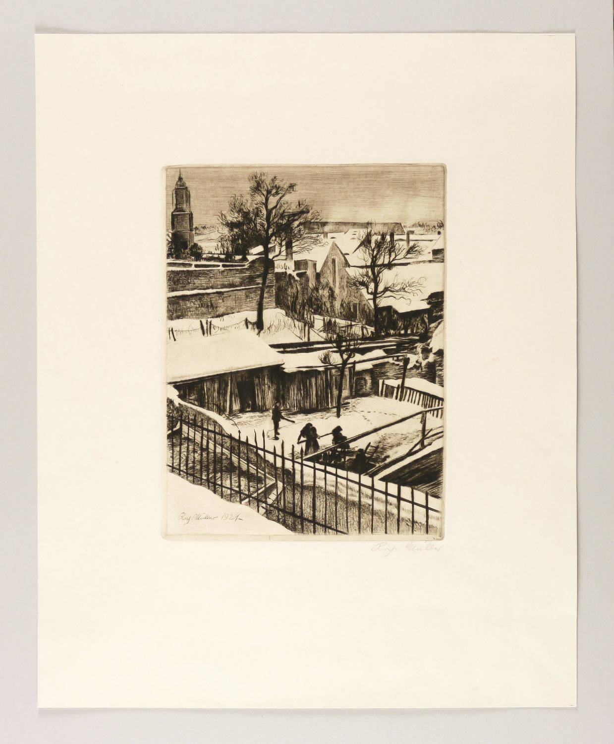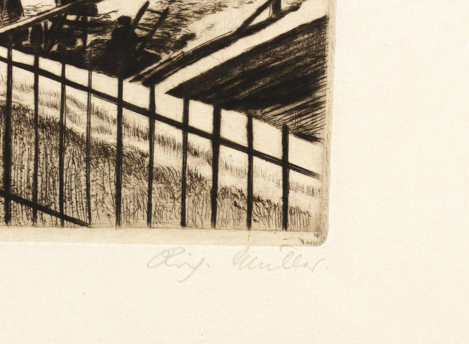 Günther 106/10. – Rechts unten in Bleistift signiert: ″Rich. Müller″. In der Platte links unten Signatur und Jahr: ″Rich. Müller 1921″. – Als Blatt Nr. 9 der Radier-Mappe ″Opus I. Zwölf Kaltnadelradierungen″ (Berlin: Kunstverlag Stiefbold & Co. 1921) angelegt. Hier ein Einzel-Abzug außerhalb der Mappenauflage. – Schwach ausgeprägte Knickspur im unteren Rand, eher unscheinbar. Sonst ohne Tadel. Noch sehr guter Zustand.