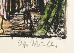 Otto Mueller (1874 Liebau - 1930 Obernigk). Oft auch Otto Müller. Deutscher Maler und Grafiker. Bedeutender Vertreter des Deutschen Expressionismus und Mitglied der Künstlergruppe Brücke. 1890-94 Lithografenlehre. 1894-96 Studium an der Kunstakademie Dresden. 1898/99 Wechsel an die Königliche Akademie der Bildenden Künste in München; Franz von Stuck verweigerte ihm die Fortführung. 1905 Heirat mit Maria Mayerhofer, "Maschka", die ihm meist Modell stand. 1908 Umzug nach Berlin, wo er die für ihn charakteristische Maltechnik mit Leimfarben auf groben Leinwänden entwickelte und die Freundschaft zu Wilhelm Lehmbruck fand, dessen plastischer Stil starken Einfluss auf sein Kunstwollen nahm. Da der Anschluss an die Berliner Secession nicht gelang 1910 Gründung der Gruppe Neue Secession; Ausstellung "Zurückgewiesene der Secession Berlin". 1910-13 Mitglied der Künstlergruppe "Brücke". 1915 Kriegsdienst im Ersten Weltkrieg in Frankreich und Russland. 1917 schwere Lungenentzündung. 1919 Berufung zum Professor an der Staatlichen Akademie für Kunst und Kunstgewerbe in Breslau. 1921 Scheidung. Als ein Höhepunkt seines künstlerischen Schaffens gilt die "Zigeuner-Mappe" mit farbigen Lithografien, die auf längere Aufenthalte bei Zigeunern in Spalato und Sarajevo zurückgeht.