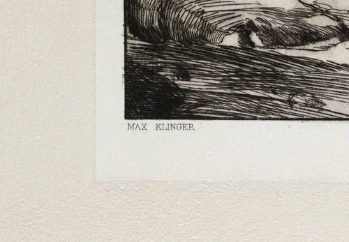 Singer 57 IV (von IV). – In der Platte links unten gestochene Signatur: ″MAX KLINGER″. Rechts unten Blatt-Nr.: ″VI″. – Blatt 6 aus dem Radier-Zyklus ″Intermezzi Opus IV″. – Schönes originalrandiges Exemplar. Leichte Randmängel. Blattkanten umlaufend etwas bestossen. Mäßig guter Zustand.