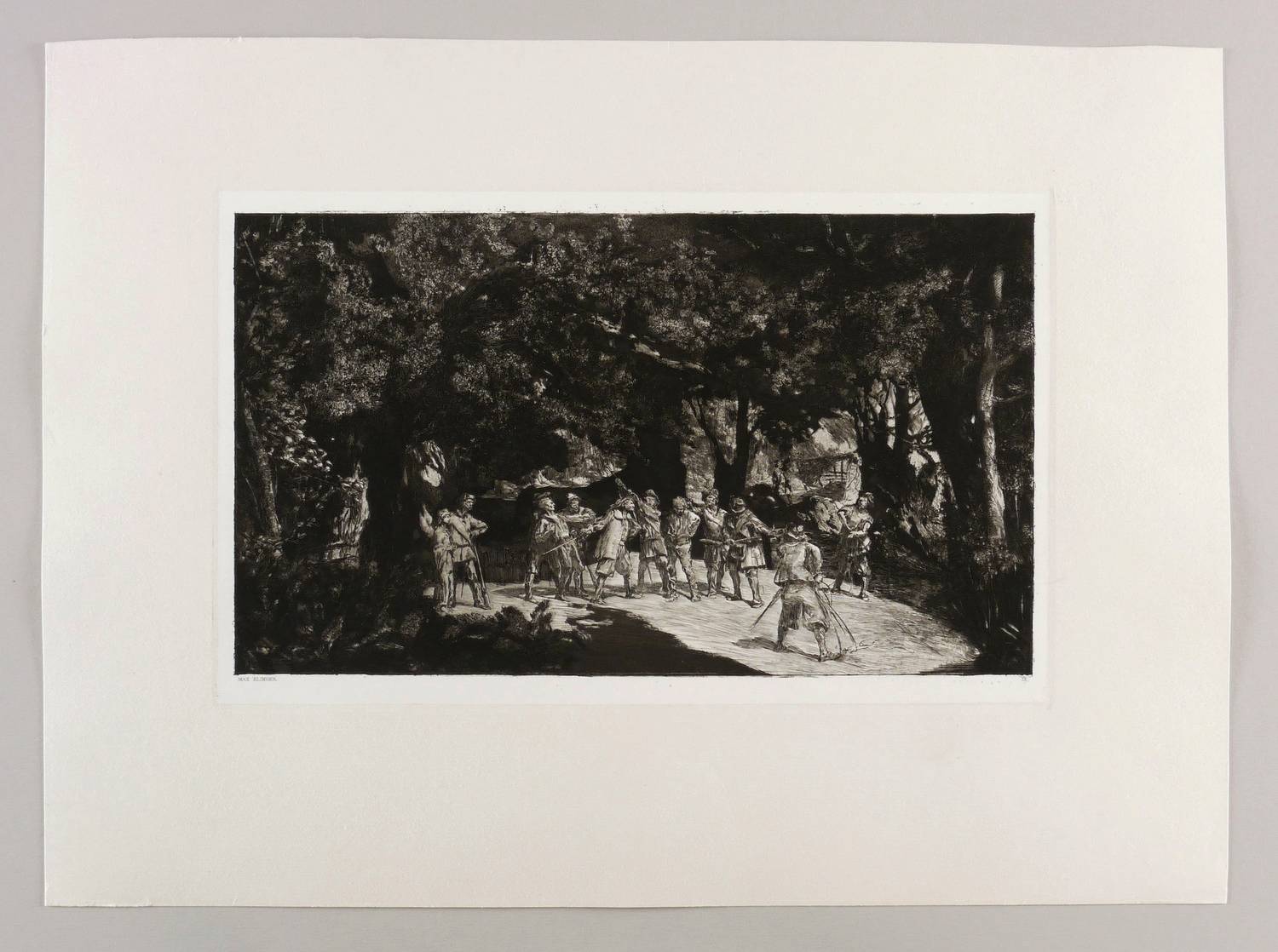 Singer 60 II (von II). – In der Platte links unter der Darstellung gestochene Signatur: ″MAX KLINGER″. Rechts Blattnummer: ″IX.″ – Die Szene aus dem Roman Simplicius Simplicissimus. – Originalrandiges Exemplar. Bis auf eine asugelegene Knickspur in der linken oberen Blattecke ohne Mängel. Insgesamt guter Zustand.