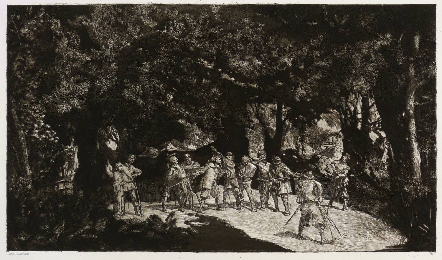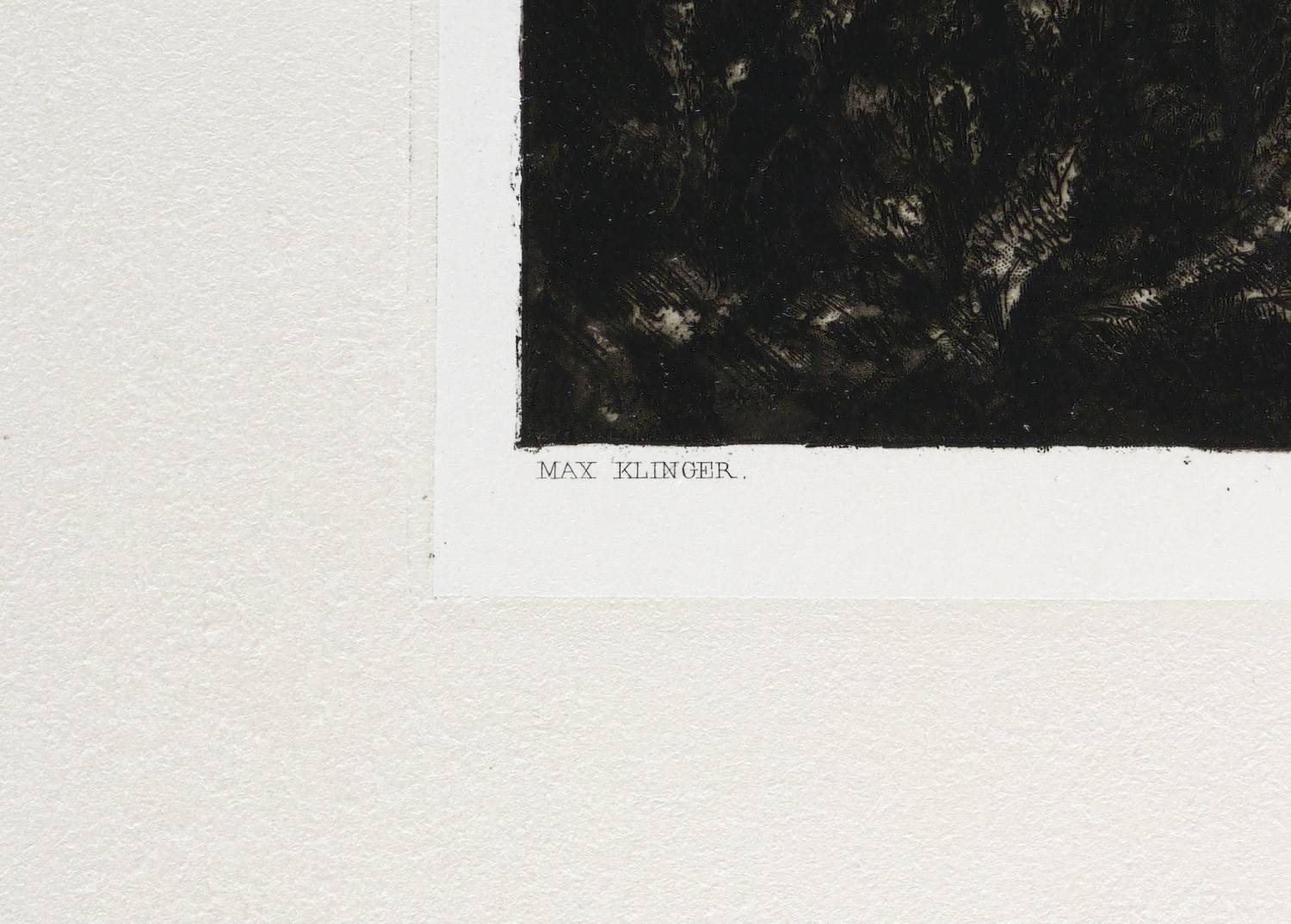 1881. Radierung / Strichätzung, in Schwarz, auf gewalztem China, auf Kupferdruckpapier. – Originale Künstlergrafik, von Max Klinger. – 23,5 x 40,5 cm (Darstellung / Einfassungslinie), 26,8 x 42,8 cm (Platte), 45 x 61 cm (Blatt).