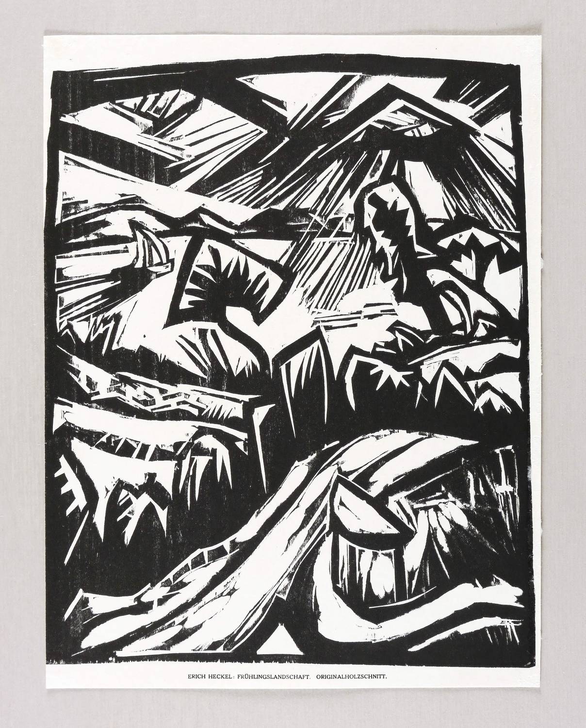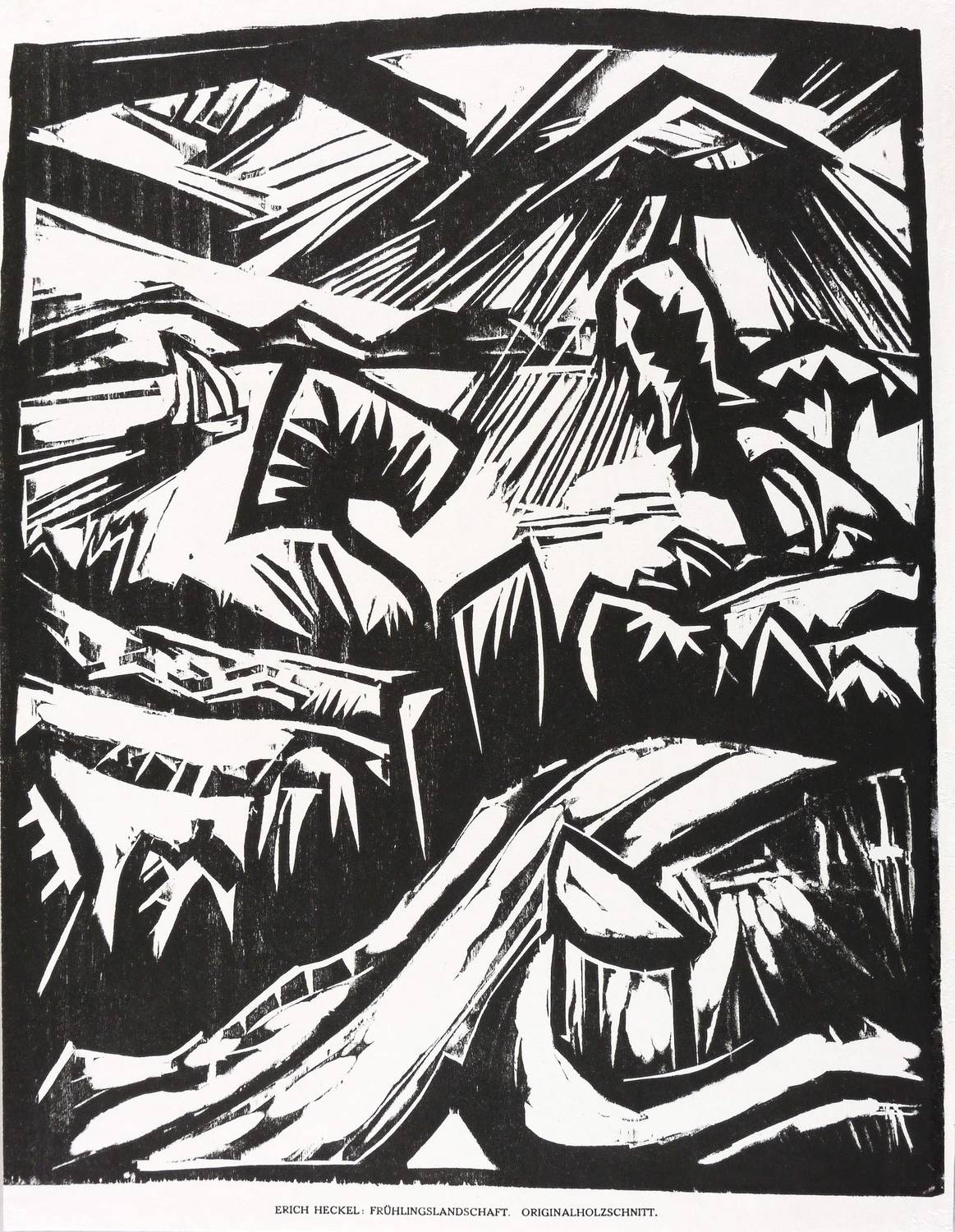 Dube H 255 B (von B). – Aus: Das Kunstblatt. Liebhaberausgabe (Weimar: Kiepenheuer 1918), Bd. 2. – Nicht handsigniert. Unterhalb der Darstellung typografisch bezeichnet: ″ERICH HECKEL: FRÜHLINGSLANDSCHAFT. ORIGINALHOLZSCHNITT.″ – Originalgrafischer Abzug aus der Auflage von 100 Exemplaren für die 1918 erschienene Liebhaberausgabe vom Weimarer ″Das Kunstblatt″. – Sehr guter Zustand.