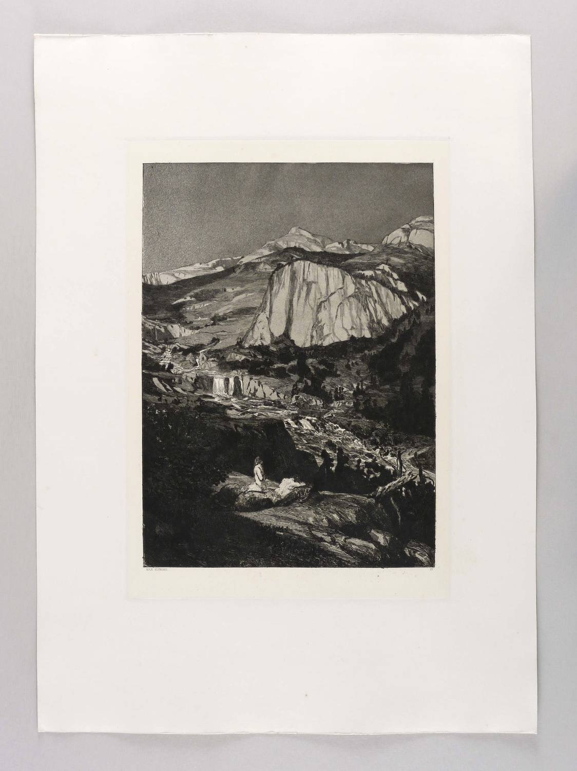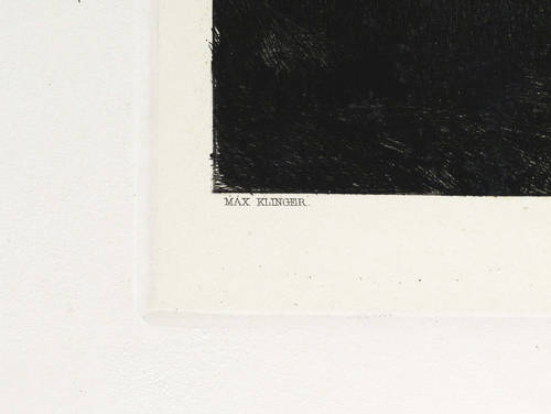 1881. Radierung / Strichätzung & Aquatinta, in Schwarz, auf aufgewalztem gelbem China, auf Kupferdruckkarton. – Originale Künstlergrafik, von Max Klinger. – 36,3 x 26,4 cm (Darstellung), 42,0 x 29,8 cm (Platte), 63 x 45 cm (Blatt).