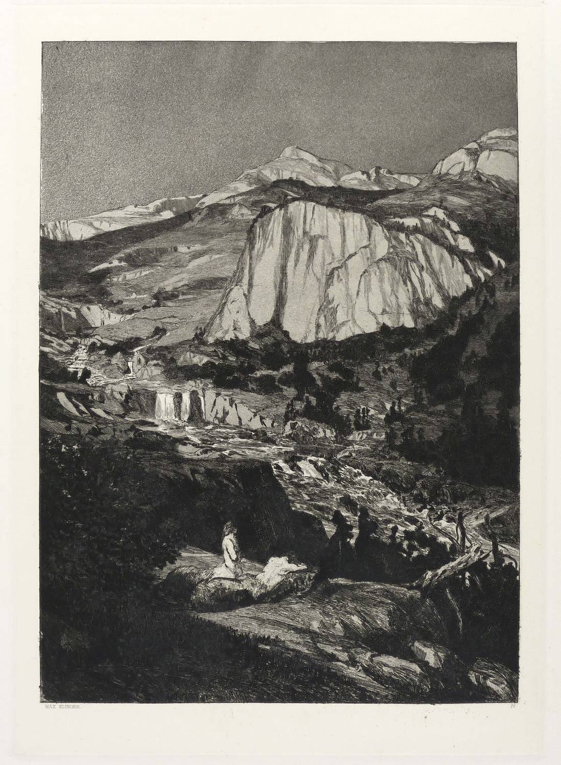 Singer 56 III (von III). – Aus: Max Klinger, Intermezzi. Componirt, radirt und Herrn Kupferstecher und Kunsthändler Sagert dankbarst zugeeignet (München: Ströfer's Kunstverlag 1881). – In der Platte links unten gestochene Signatur: ″MAX KLINGER″. Rechts römisch nummeriert: ″IV″. – Originalrandiges unbeschnittenes Exemplar. Unscheinbare Altersspuren. Im unteren Rand winziges Fleckchen. Insgesamt guter Zustand.