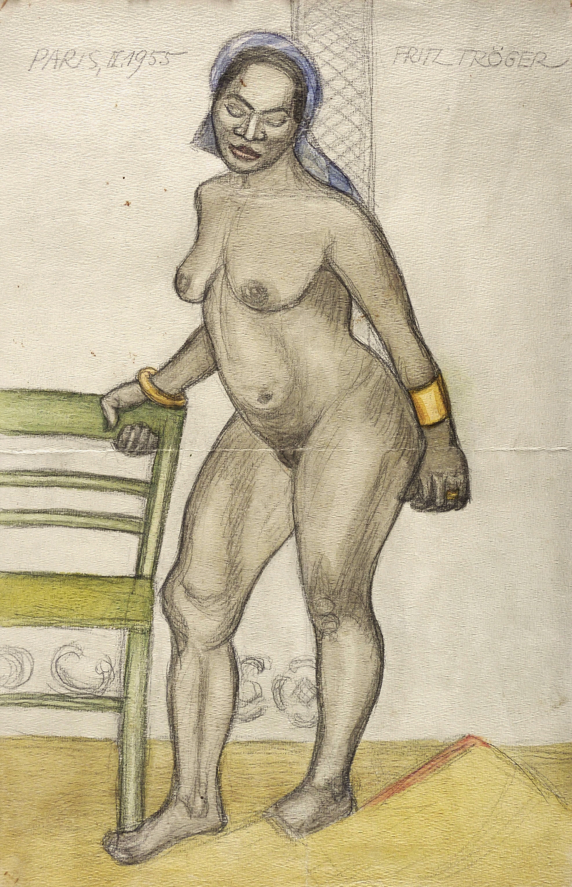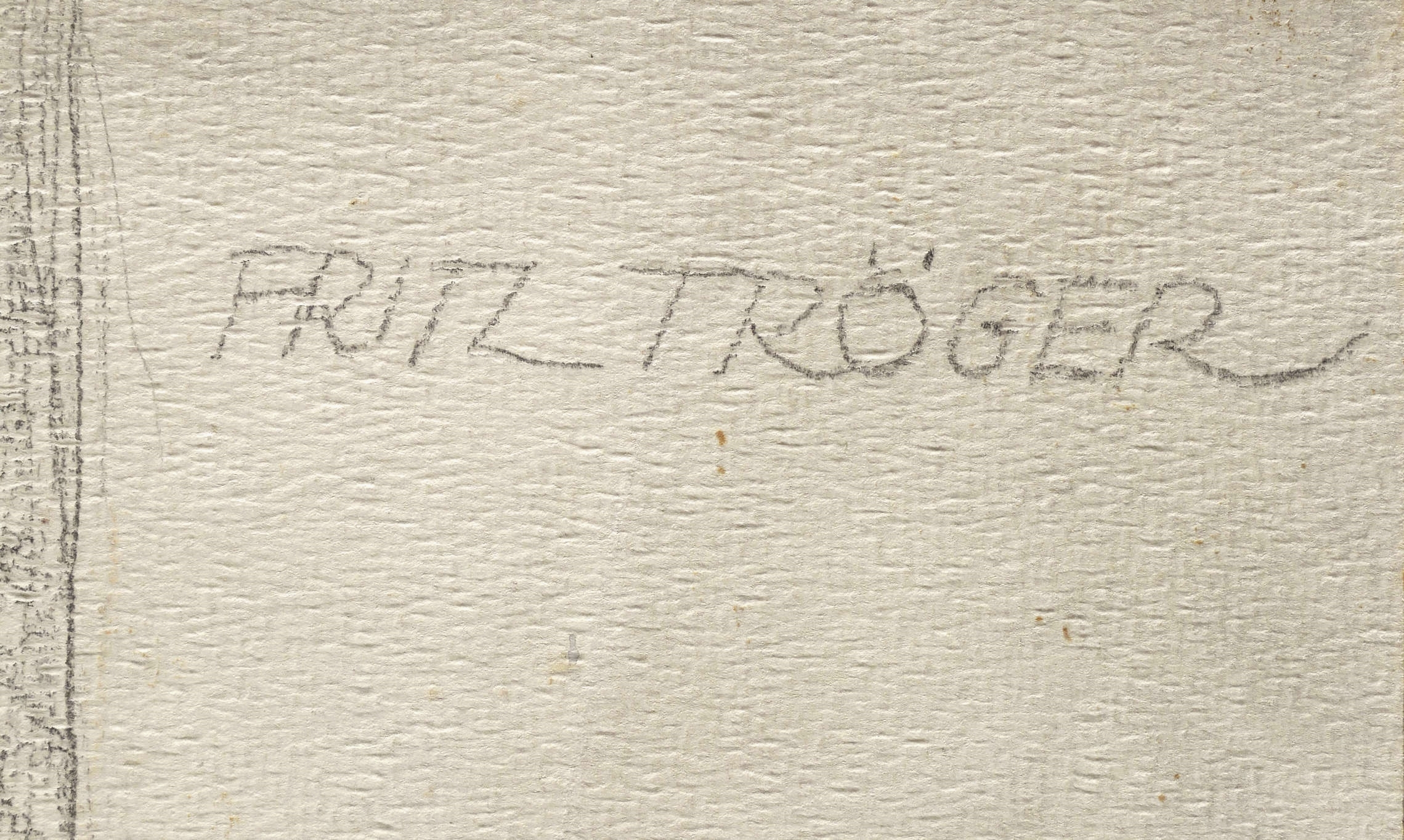In den oberen Blattecken in Bleistift bezeichnet und signiert: ″PARIS, II. 1955 // FRITZ TRÖGER″. Verso leicht verblasst in Farbstift bezeichnet: ″In der Akademie (...) // FRITZ TRÖGER (...)″. – Arbeit von der ersten Pariser Reise. – Weitgehend ausgelegene Lagerfalten. Zwei alt, wohl noch vom Künstler hinterlegte Randrisse. Insgesamt mäßig guter Zustand.