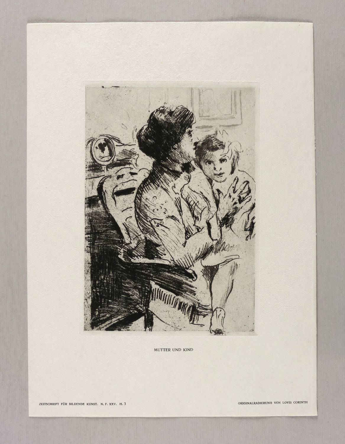 Schwarz 60. – Aus: Zeitschrift für bildende Kunst (Leipzig: E.A. Seemann 1914), Bd. 25. – Nicht handsigniert. In der Blattecke rechts unten typografisch bezeichnet: ″ORIGINALRADIERUNG VON LOVIS CORINTH″. Mittig Titel: ″MUTTER UND KIND″. – Originalgrafische Beilage des Jahrgangs 1914 der Zeitschrift für Bildende Kunst. – Sehr guter Zustand.