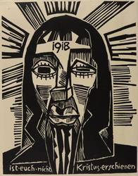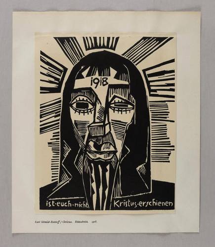 Aus: Genius. Zeitschrift für werdende und alte Kunst (München: Kurt Wolff 1919), Bd. 1. – Unterhalb typografisch bezeichnet: ″Karl Schmidt-Rottluff / Christus. Holzschnitt. 1918.″ In der Darstellung geschnittene Inschrift: ″ist euch nicht Kristus erschienen″. – Originaler Zinkhochdruck (Klischeedruck) für die Luxusausgabe des Genius nach dem Holzschnitt von 1918 (vgl. WVZ Schapire H 208). – Original auf Trägerpapier gesetzt. Tadellos erhalten. Sehr guter Zustand.