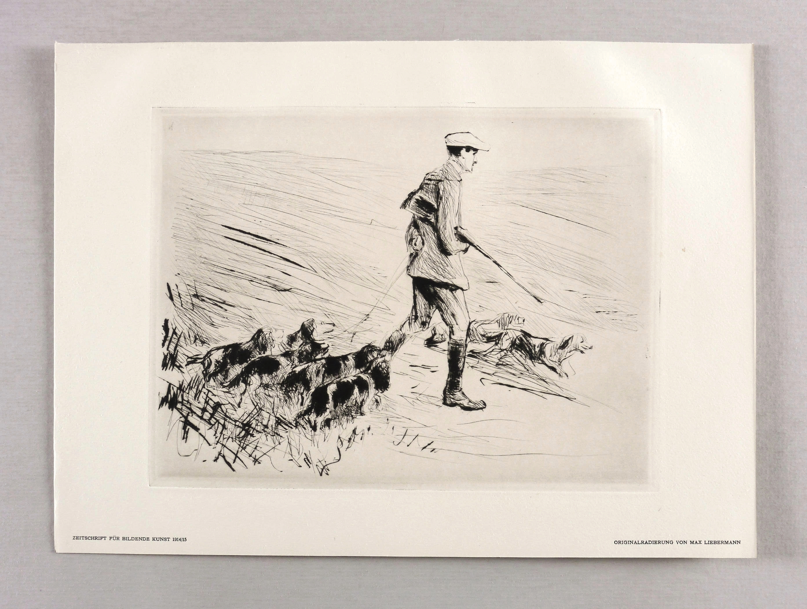 Schiefler 161 III c. – Aus: Zeitschrift für bildende Kunst (Leipzig: E.A. Seemann 1915), Bd. 26. – Nicht handsigniert. Im unteren Blattrand typografisch bezeichnet: ″ORIGINALRADIERUNG VON MAX LIEBERMANN″. Links Verlagsadresse. – Auflagendruck und originalgrafische Beilage der ″Zeitschrift für bildende Kunst″ (Neue Folge XXVI, 1915). - 1913 hatte Liebermann in den Dünen bei Nordwijk das Motiv des Jägers oder Trainers mit einer Meute Spaniel-Hunden gemalt. Die dabei angefertigten Zeichnungen entwickelte er im Winter im Atelier weiter, unter anderem zu dieser Radierung. – Sehr guter Zustand.