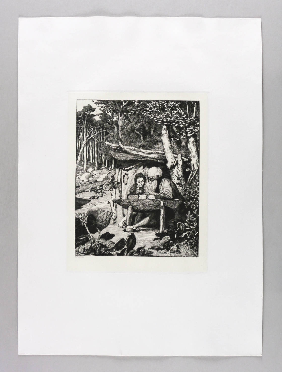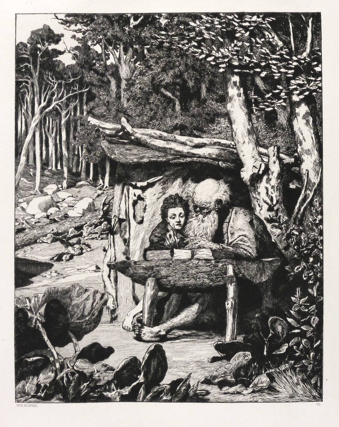 Singer 58 III (von III). – In der Platte links unter der Darstellung gestochene Signatur: ″MAX KLINGER″. Rechts Blattnummer: ″VII.″ – Die Szene aus dem Roman Simplicius Simplicissimus in welcher Simplicius mit dem Einsiedler über eine Baumstammhälfte gebeugt sitzt. Dieser führt ihm beim Schreiben helfend die Hand. - Gratiger und kontrastreicher Abzug. – Originalrandiges Exemplar. Sehr guter Zustand.