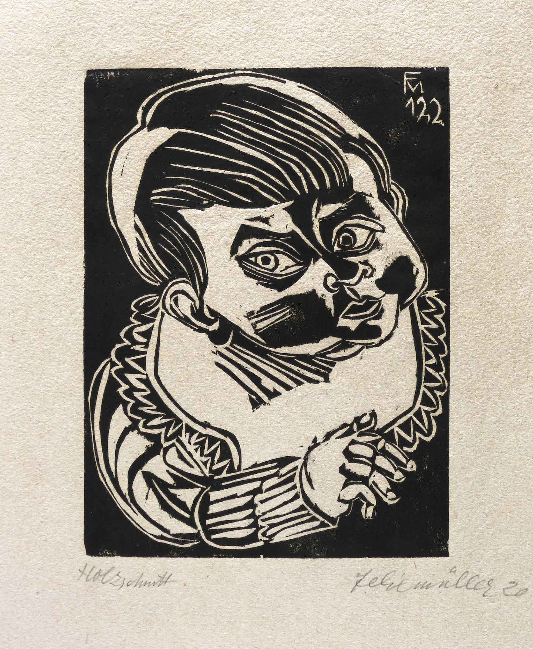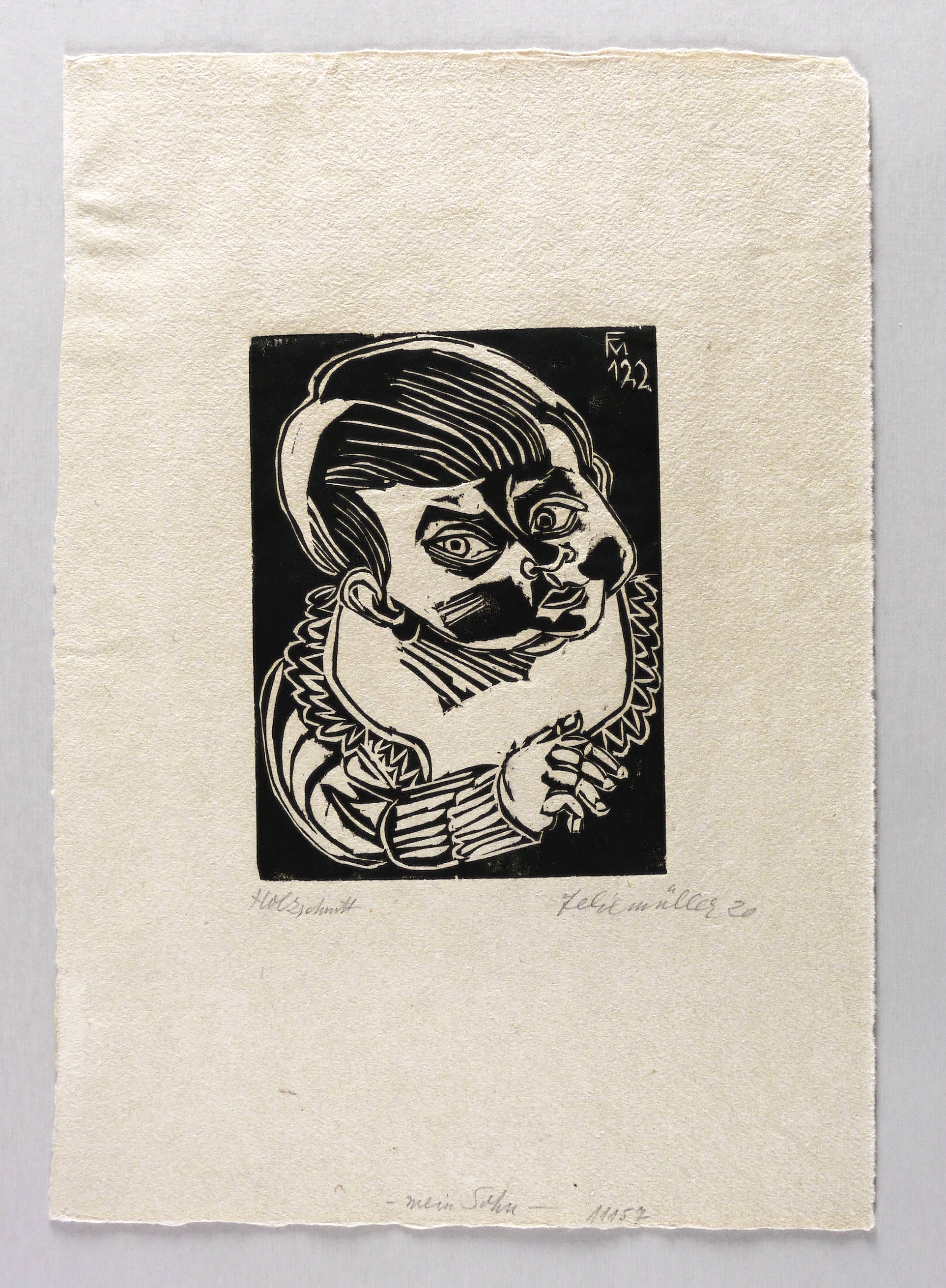 Söhn 190 a (von b). – Rechts unten in Bleistift signiert und datiert: ″Felixmüller 20″. Links Technikbezeichnung: ″Holzschnitt″. Im unteren Blattrand weiter eigenhändig bezeichnet: ″- mein Sohn -″. Im Druckstock rechts oben monogrammiert und nummeriert: ″FM 122″. – Papier kaum merklich gegilbt. Im linken Blattrand rückseitig ältere Montagereste von Papiergelenken. Keine ersichtlichen Mängel. Sehr guter Zustand.