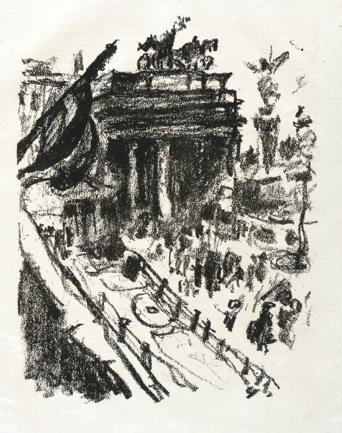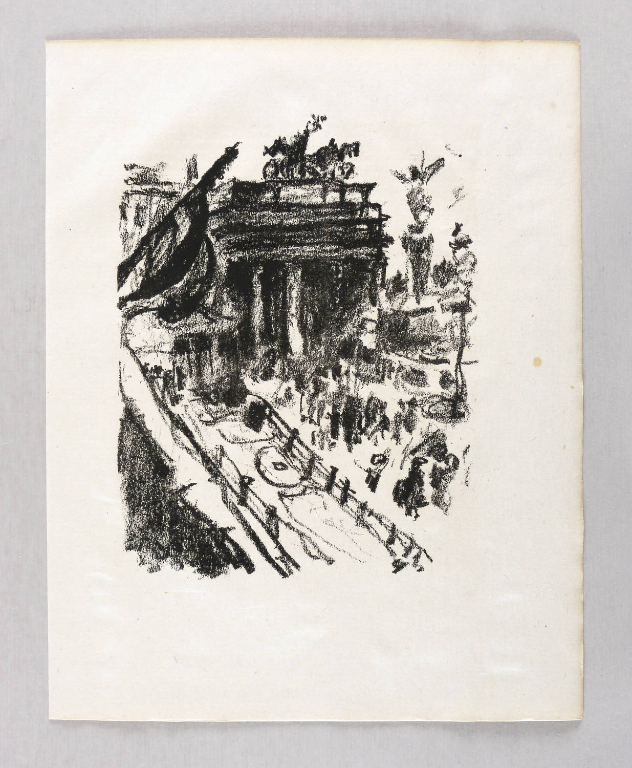Schwarz L 416. – Nicht handsigniert. Verso in Bleistift bezeichnet. – Bei Karl Schwarz beschrieben als: ″Das Brandenburger Tor, vom 1. Stock der Akademie der bildenden Künste aus gesehen. Am linken Rande auf dreiviertel Höhe eine große flatternde Fahne, schräg bildeinwärts ragend. Im Hintergrund die Siegessäule.″ (WVZ Schwarz, S. 222/223). - Laut Schwarz nur 15 signiert Abzüge. – Originalrandiges Exemplar. Kleines bräunliches Fleckchen im rechten Rand. Im Ganzen etwas wellig. Mäßig guter Zustand.