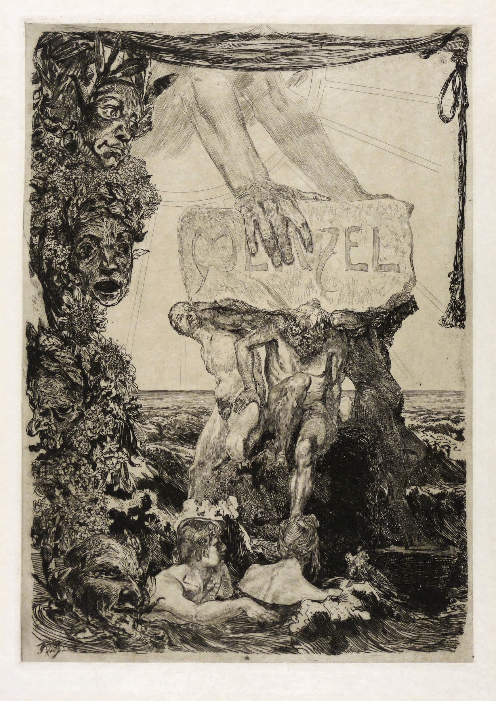 Singer 268 IV (von IV). – In der Platte links unten in der Darstellung gestochene Signatur: ″M Klinger″. Mittig Pentagramm. Auf dem Felsblock im Zentrum der Darstellung Inschrift: ″MENZEL″. – Druck der 1852 gegründeten Druckerei Giesecke & Devrient in Leipzig, in der Klinger zahlreiche seiner Radierungen drucken ließ. – Erschienen zur Ehrenfeier für Adolph von Menzel am 5. April 1884 des Vereins Berliner Künstler. – Blattrücken im linken Rand mit kaum merklichen Montagespuren. Keine Mängel. Sehr guter Zustand.