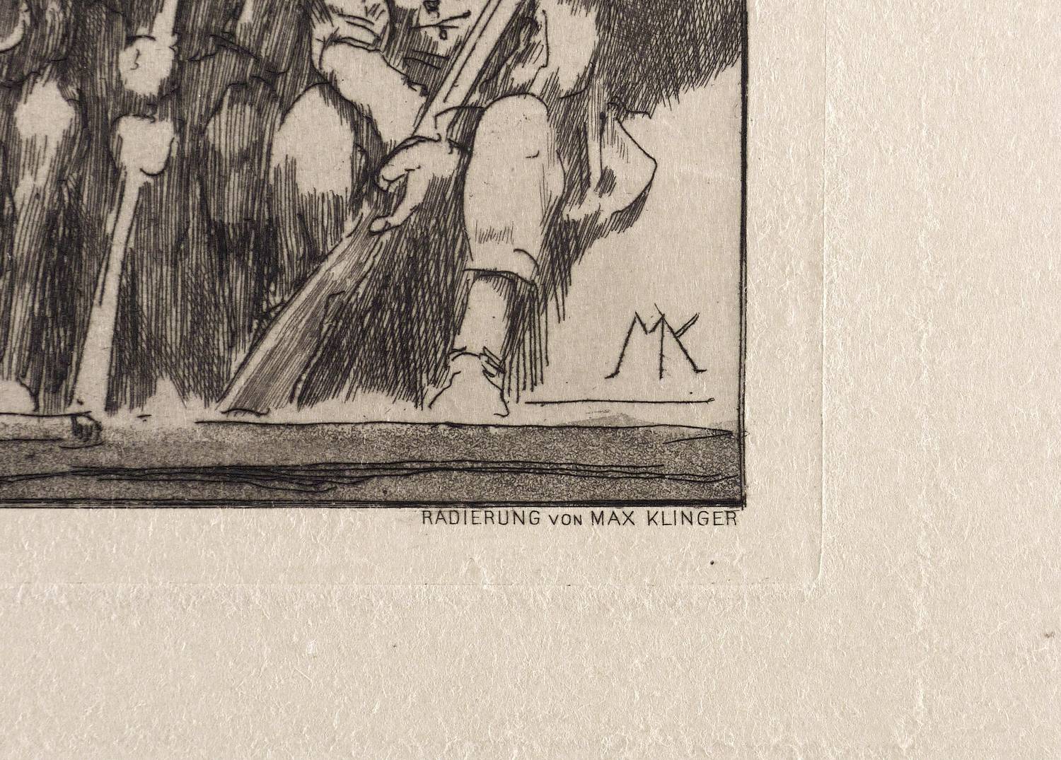 Singer 429 II (von II). – Nicht handsigniert. In der Darstellung rechts unten Monogramm: ″MK″. In der Platte rechts unten gestochene Signatur: ″RADIERUNG von MAX KLINGER″. Links Verlagsadresse E.A. Seemann. – Provenienz: Sammlung Gerlint Söder und Erhard Frommhold, Dresden – Tadellos. Sehr guter Zustand.