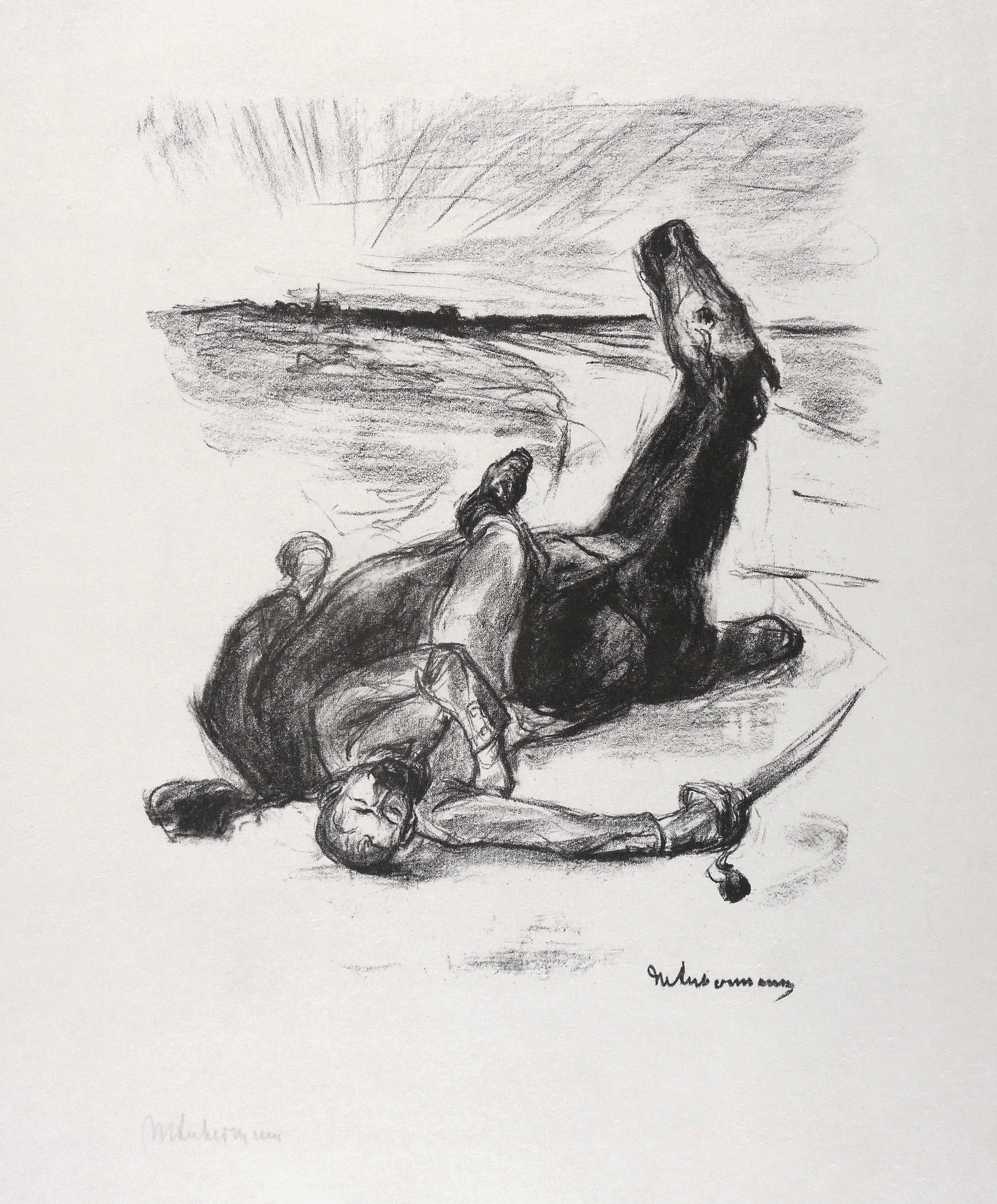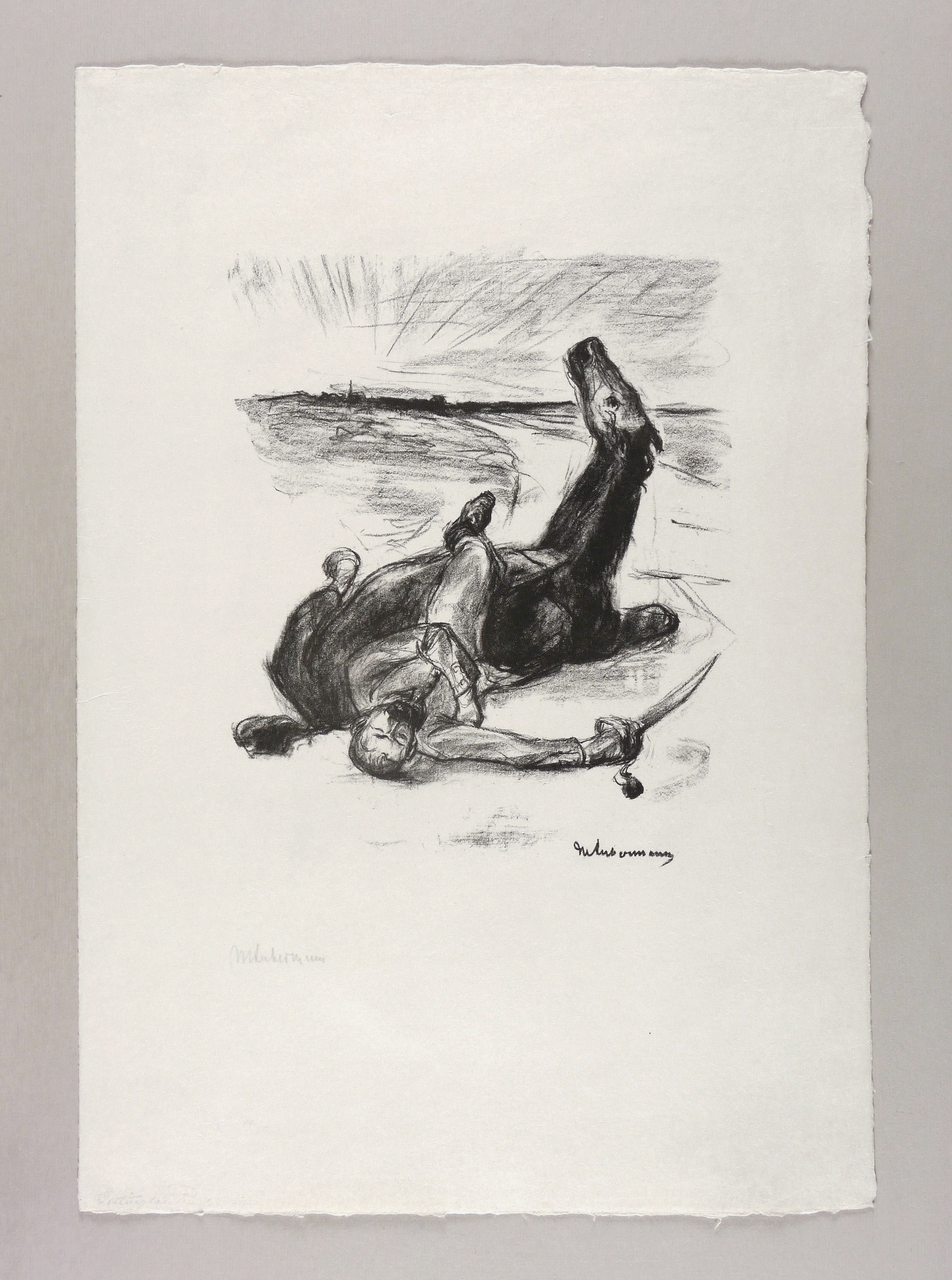 Schiefler 200. – Links unten in Bleistift signiert: ″MLiebermann″. In der linken unteren Blattecke Trockenstempel und Titel: ″Gestürzter Reiter″. Im Stein rechts unten nochmals Signatur. – Originalrandiges Exemplar. Papier in den Blatträndern unmerklich angestaubt. Sehr guter Zustand.