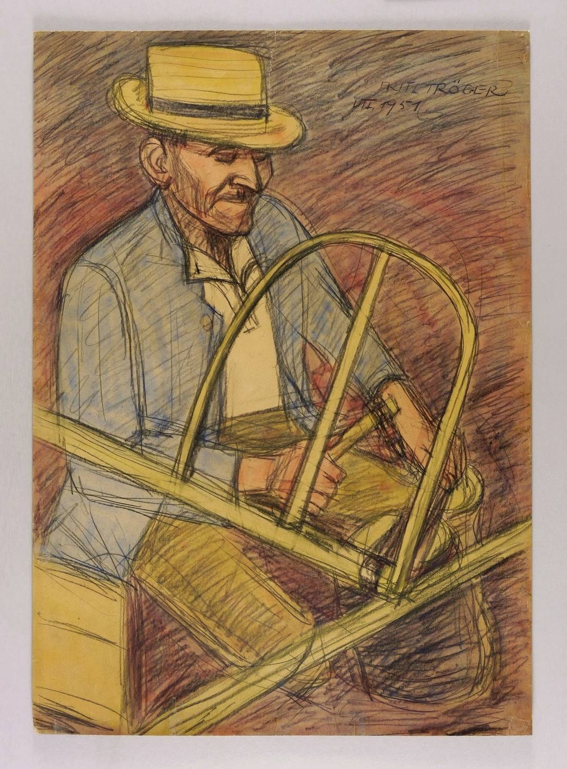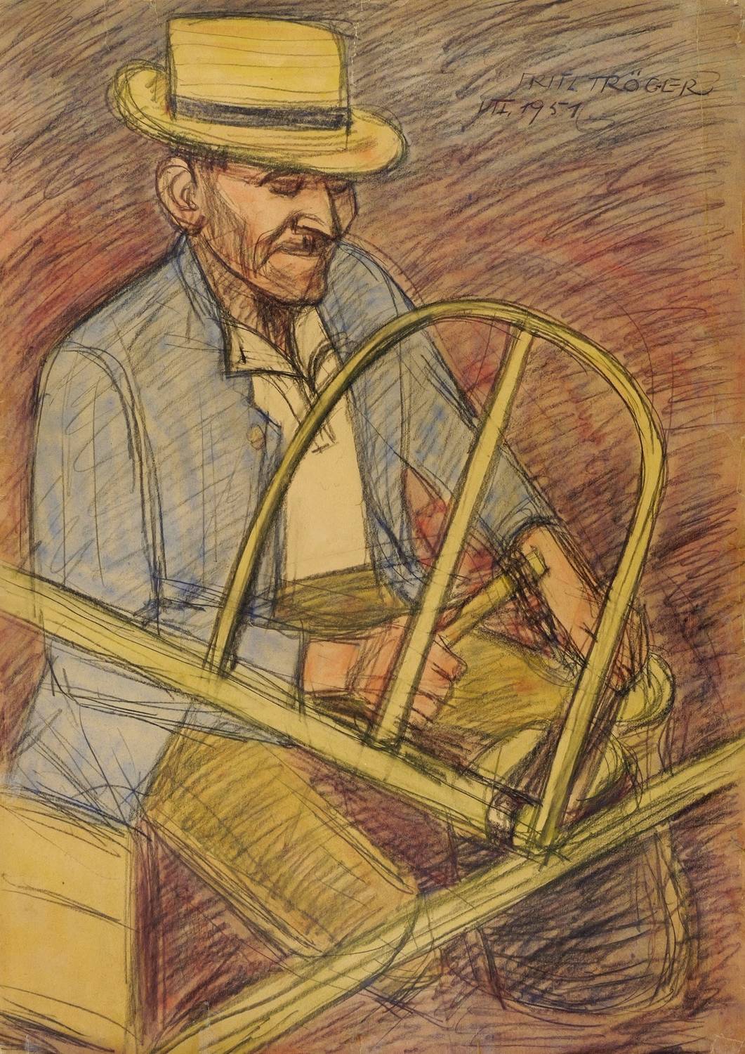 Rechts oben in schwarzer Kreide signiert und datiert: ″FRITZ TRÖGER / VII. 1951″. Verso in Bleistift bezeichnet: ″Bauer beim Dengeln / kreide mit Aquarell″. Dazu Qualitätssigel des Künstlers: ″XXX″. – Mehrere Randrisse fachgerecht geschlossen. Mäßig guter Zustand.