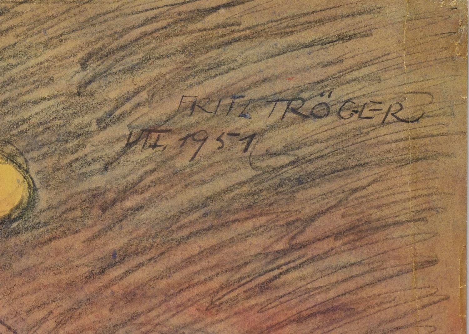 1951. Mischtechnik / Kreide & Aquarell, auf orange-braunem Karton. – Originale Künstlergrafik, von Fritz Tröger. – Unikat. – 73,2 x 51,8 cm (Darstellung / Blatt).