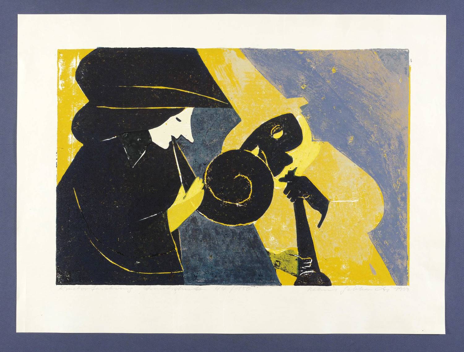 1979. Farblinolschnitt, in 6 Farben, auf glattem weißem Büttenpapier. – Originale Künstlergrafik, von Helmut Gebhardt. – Auflage Exemplar Nr. 44/150. – 31,7 x 46,9 cm (Darstellung / Druckbild), 43 x 57 cm (Blatt).
