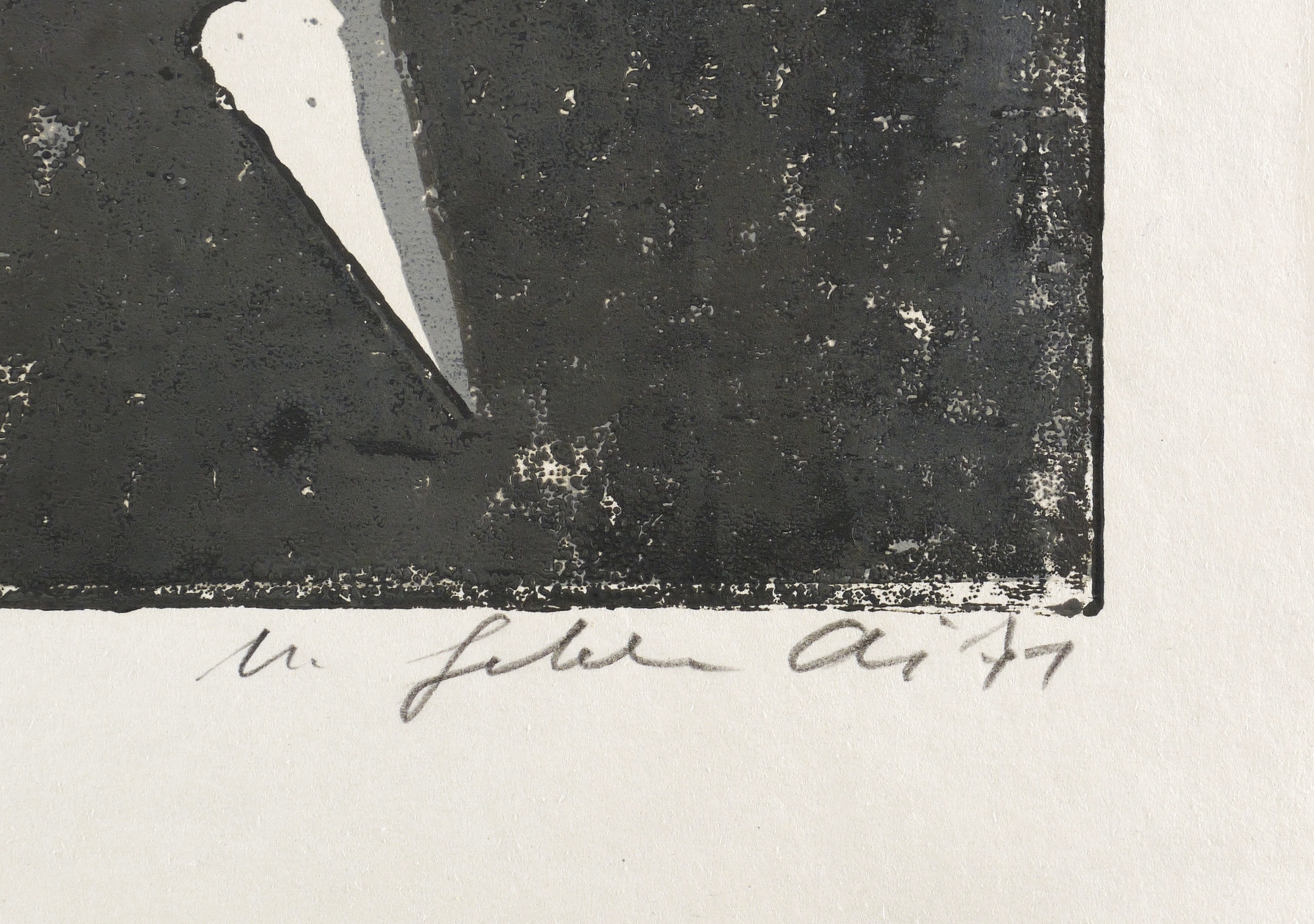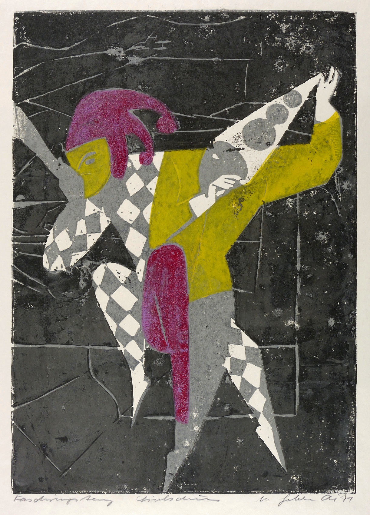 Rechts unten in Bleistift signiert und datiert: ″H. Gebhardt 71″. Links Titel: ″Faschingstag″. Mittig Technikbezeichnung: ″Linolschnitt″. – Gut erhalten. Guter bis sehr guter Zustand.