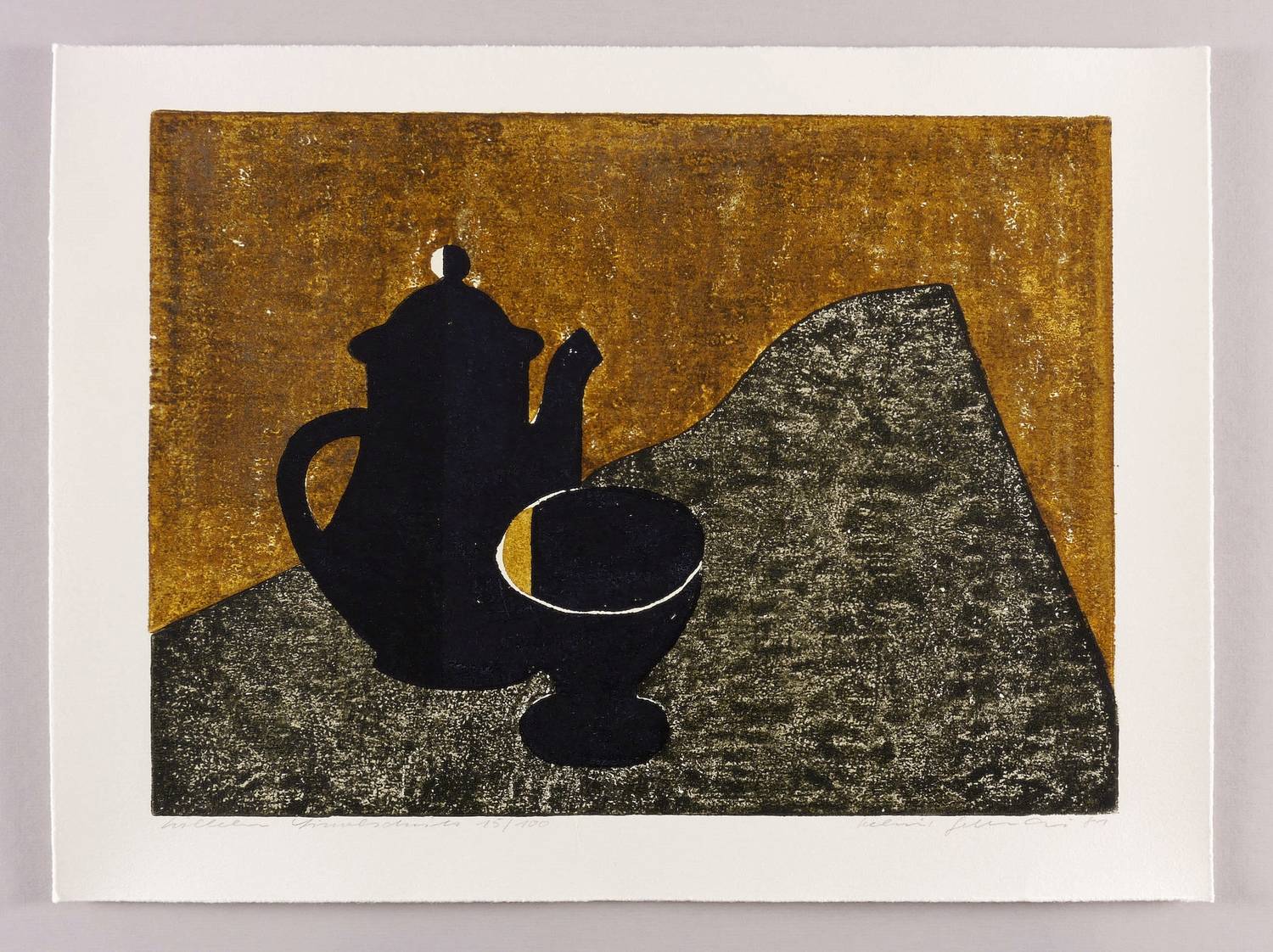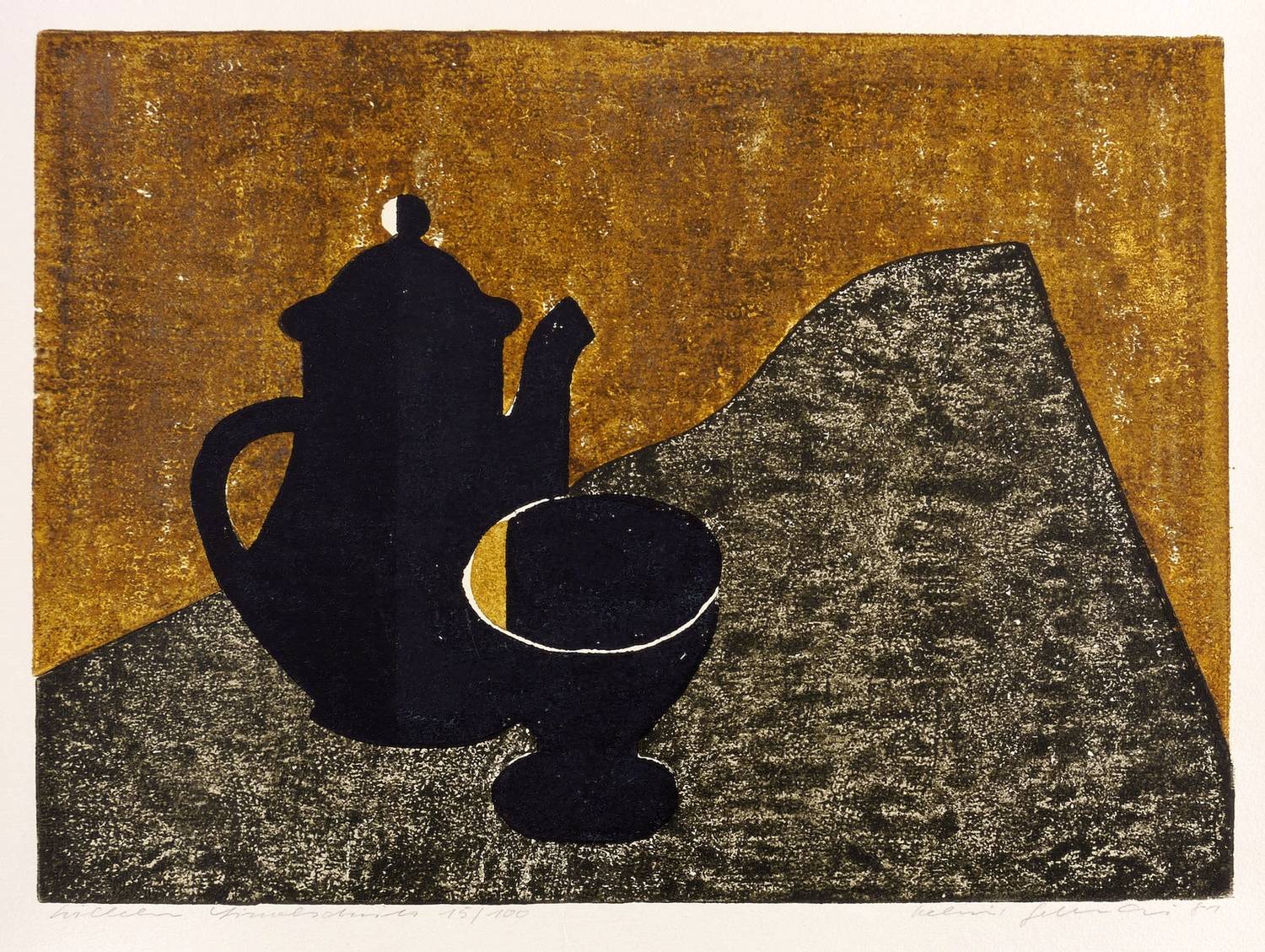 1981. Farblinolschnitt, von 3 Platten, in 3 Farben, auf schwerem Hahnemühle. – Originale Künstlergrafik, von Helmut Gebhardt. – Auflage Exemplar Nr. 15/100. – 32,8 x 45,1 cm (Darstellung / Druckbild), 40 x 54 cm (Blatt).