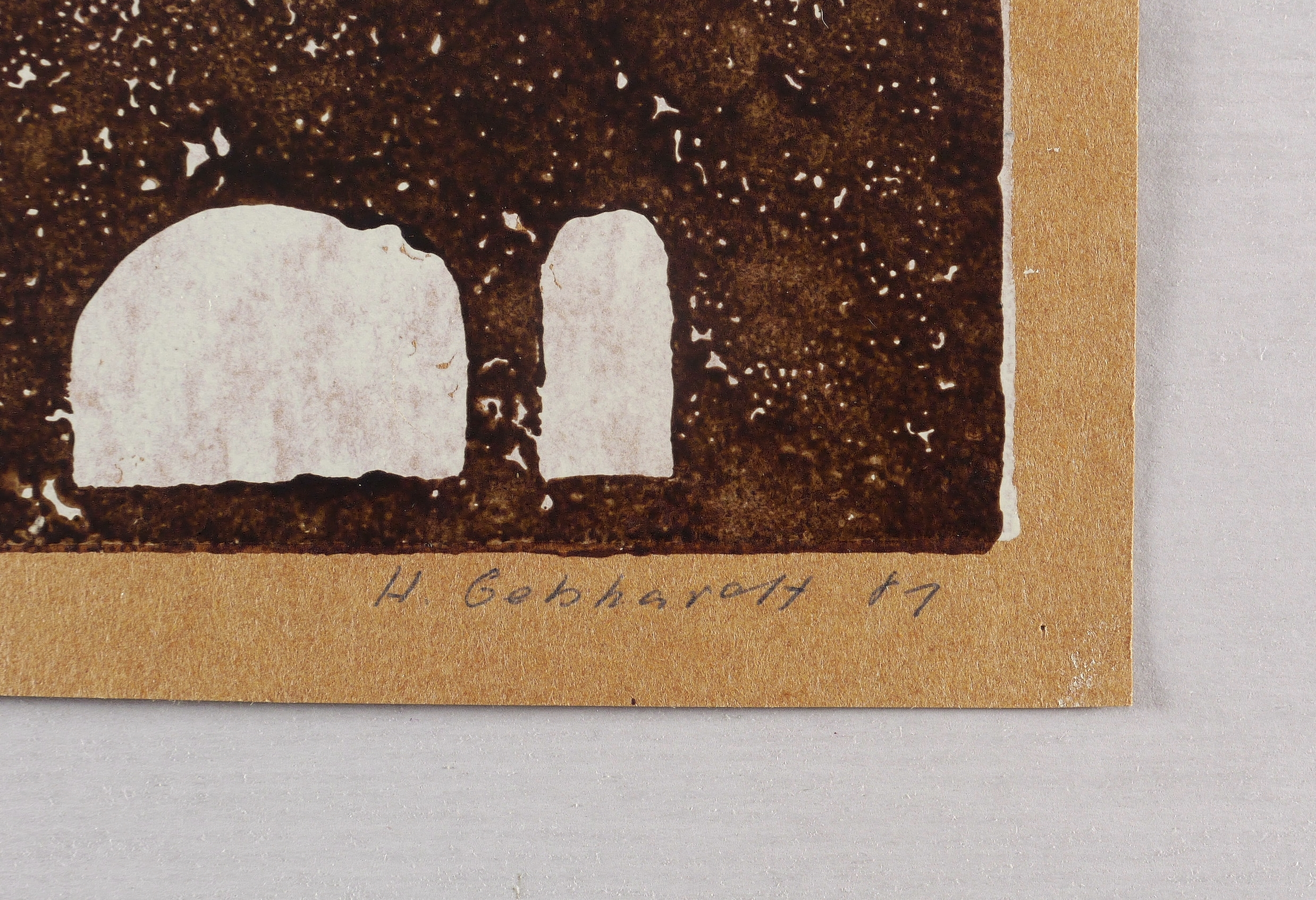 1981. Farblinolschnitt, in Braun & Weiß, auf braunem Velinkarton. – Originale Künstlergrafik, von Helmut Gebhardt. – Künstlerexemplar (e.a.). – 27,8 x 18,5 cm (Darstellung / Druckbild), 30 x 21 cm (Blatt).